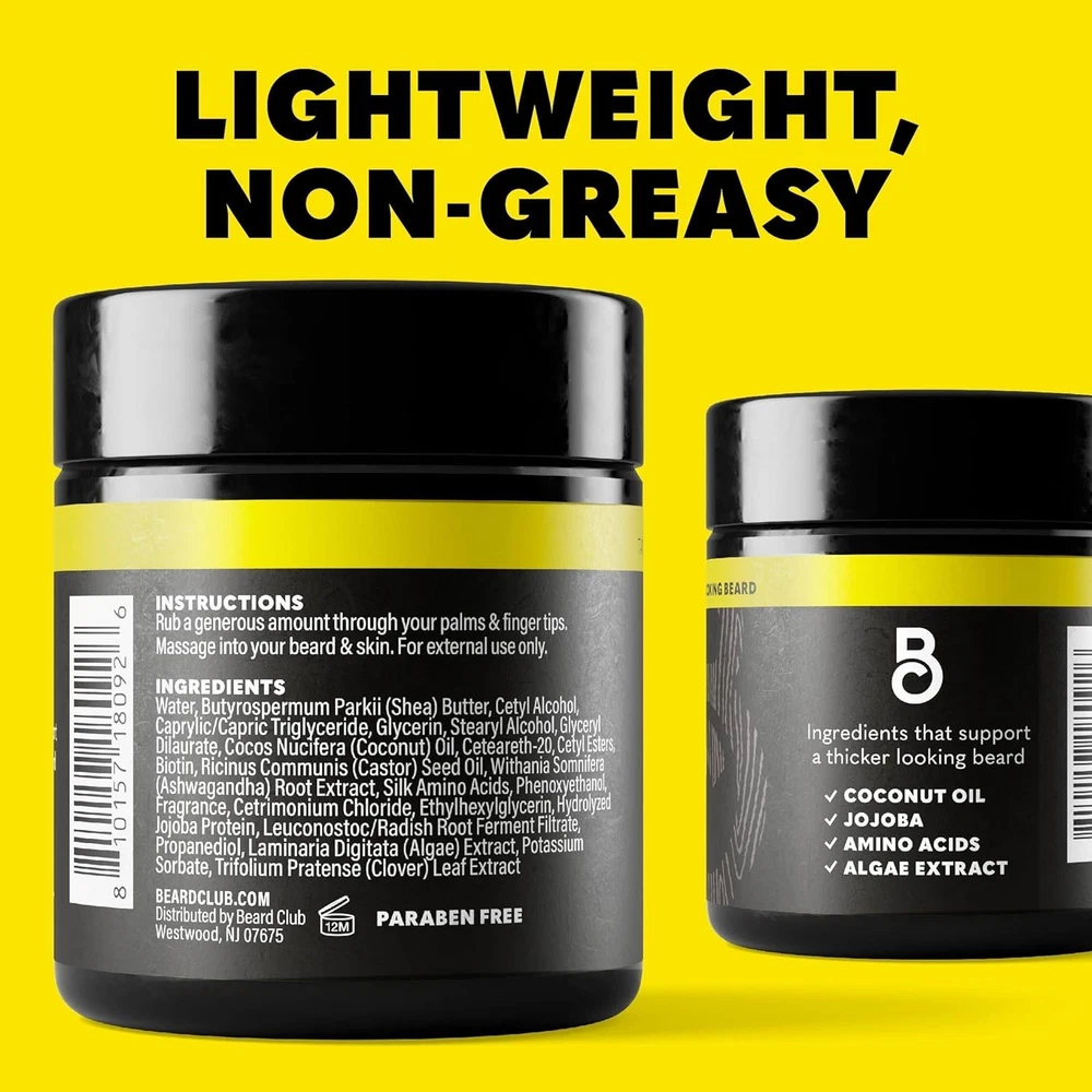 Support a Fuller, Thicker-Looking Beard – Infused with 2X biotin*, this beard balm deeply nourishes and strengthens facial hair, promoting a fuller-looking beard while softening coarse strands. (*vs. Beard Club Beard & Scruff Cream) Condition & Soften – Packed with shea butter, castor oil, and coconut oil, this beard butter for men locks in moisture, tames flyaways, and smooths unruly hairs for effortless beard styling Hydrate & Reduce Beard Discomfort – This non-greasy leave-in beard conditioner moisturizes the skin beneath, helping to reduce dryness and beard discomfort while keeping your beard soft, manageable, and touchably smooth all day long. Lightweight, Non-Greasy Formula – Unlike heavy wax balms, this beard moisturizer for men absorbs quickly, leaving no sticky residue—perfect for daily beard care, styling, and conditioning Amber Cedar Scent for Freshness – This beard cream for men features a masculine amber cedar scent, keeping your beard smelling fresh while doubling as a beard softener, leave-in conditioner, and beard styling balm Product Description The video showcases the product in use. The video guides you through product setup. The video compares multiple products. The video shows the product being unpacked. hero-video Merchant Video Thickening Biotin Beard Growth Balm Add to Cart Add to Cart Add to Cart Add to Cart Add to Cart Add to Cart Add to Cart Customer Reviews 4.2 out of 5 stars 3,433 4.2 out of 5 stars 3,433 4.4 out of 5 stars 2,567 4.1 out of 5 stars 386 4.2 out of 5 stars 1,194 4.1 out of 5 stars 2,981 4.4 out of 5 stars 765 Price $9.49 $ 9 . 49 $19.99 $ 19 . 99 $6.99 $ 6 . 99 $24.99 $ 24 . 99 $44.99 $ 44 . 99 $67.99 $ 67 . 99 $37.99 $ 37 . 99 Usage Support Growth & Soften Beard Support Growth & Soften Beard Exfoliate Skin/Support Growth Exfoliate Skin/Support Growth Exfoliate Skin/Support Growth Exfoliate Skin/Support Growth Clean, Groom, and Style Beard Scent Amber Cedar Cedar N/A Woodsy Scent Woodsy Scent Cedar Cedar & Sandalwood Hydrates Skin & Follicles ✔ ✔ ✘ ✔ ✔ ✔ ✔ Helps to Promote Growth ✔ ✔ ✔ ✔ ✔ ✔ ✔ Includes Biotin ✔ ✘ ✘ ✔ ✔ ✔ ✘