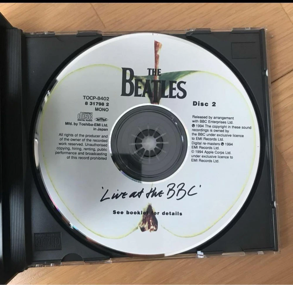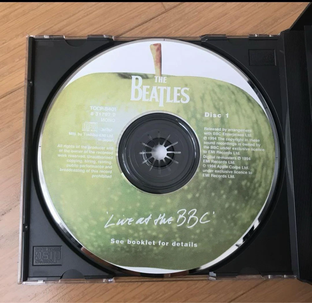 Description A Beatles album released as a two-disc set on November 30, 1994. Contains the best 56 songs from live studio recordings broadcast on BBC Radio in the UK from 1962 to 1965. This is the first official album of unreleased songs since 1977's ``The Beatles Super Live!''. The executive producer is George Martin. Digitally remastered sound source by Sonic Solution System. Talks with BBC DJs and members are also recorded at 13 locations. Full of unreleased photos! Japanese edition CD. Comes with a booklet with lyrics and commentary (Japanese). 1994 Toshiba EMI The case has some signs of use, but the disc surface is in good condition with no noticeable damage and can be played on a home CD player without any problems. 1-01 Beatle Greetings (Speech) 1-02 From Us To You 1-03 Riding On A Bus (Speech) 1-04 I Got A Woman 1-05 Too Much Monkey Business 1-06 Keep Your Hands Off My Baby 1-07 I’ll Be On My Way 1-08 Young Blood 1-09 A Shot Of Rhythm And Blues 1-10 Sure To Fall (In Love With You) 1-11 Some Other Guy 1-12 Thank You Girl 1-13 Sha La La La La! (Speech) 1-14 Baby It’s You 1-15 That’s All Right (Mama) 1-16 Carol 1-17 Soldier Of Love 1-18 A Little Rhyme (Speech) 1-19 Clarabella 1-20 I’m Gonna Sit Right Down And Cry (Over You) 1-21 Crying, Waiting, Hoping 1-22 Dear Wack! (Speech) 1-23 You Really Got A Hold On Me 1-24 To Know Her Is To Love Her 1-25 A Taste Of Honey 1-26 Long Tall Sally 1-27 I Saw Her Standing There 1-28 The Honeymoon Song 1-29 Johnny B Goode 1-30 Memphis, Tennessee 1-31 Lucille 1-32 Can’t Buy Me Love 1-33 From Fluff To You (Speech) 1-34 Till There Was You 2-01 Crinsk Dee Night (Speech) 2-02 A Hard Day’s Night 2-03 Have A Banana! (Speech) 2-04 I Wanna Be Your Man 2-05 Just A Rumour (Speech) 2-06 Roll Over Beethoven 2-07 All My Loving 2-08 Things We Said Today 2-09 She’s A Woman 2-10 Sweet Little Sixteen 2-11 1822! (Speech) 2-12 Lonesome Tears In My Eyes 2-13 Nothin’ Shakin’ 2-14 The Hippy Hippy Shake 2-15 Glad All Over 2-16 I Just Don’t Understand 2-17 So How Come (No One Loves Me) 2-18 I Feel Fine 2-19 I'm A Loser 2-20 Everybody's Trying To Be My Baby 2-21 Rock And Roll Music 2-22 Ticket To Ride 2-23 Dizzy Miss Lizzy 2-24 Medley: Kansas City/Hey! Hey! Hey! Hey! 2-25 Set Fire To That Lot! (Speech) 2-26 Matchbox 2-27 I Forgot To Remember To Forget 2-28 Love These Goon Shows! (Speech) 2-29 I Got To Find My Baby 2-30 Ooh! My Soul 2-31 Ooh! My Arms (Speech) 2-32 Don't Ever Change 2-33 Slow Down 2-34 Honey Don't 2-35 Love Me Do Label: Apple Records – TOCP-8401・02, Odeon – TOCP-8401・02, Apple Records – 8 31797~98 2, Odeon – 8 31797~98 2 Format: 2 x CD, Album, Remastered, Mono Country: Japan Released: 1994年12月1日 Genre: Rock, Non-Music, Pop Style: Beat, Rock & Roll, Rockabilly, Speech, Interview If you have any questions, please do not hesitate to ask. ^_^ Policy Payment You can use various payment methods based on eBay Managed Payments. Import duties, taxes and charges are not included in the item price or shipping charges. These charges are the buyer's responsibility. Shipping Expedited Shipping We always send the item with a tracking number. So please place an order without any concern on delivery. You can always track the delivery status. Shipping is only available to the address registered in eBay. If you want us to send another address, please change your address on eBay and then place an order. Shipping is available from Monday to Friday. Weekends are not available because freight companies are closed. Economy Shipping Delivery in 2-4 weeks. It may be delayed depending on the area and weather. Without tracking number. Cancellations & Returns Cancellation or returns will be accepted only if the item has an obvious problem that was not mentioned in the listing description. If that, please let us know within 3 days you got the item. Buyer is responsible for shipping costs and any charge incurred shipping products back. International Buyers Import duties, taxes and charges are not included in the item price or shipping charges. These charges are the buyer's responsibility. Please check with your country's customs office to determine what these additional costs will be prior to bidding/buying. These charges are normally collected by the delivering freight (shipping) company or when you pick the item up - do not confuse them for additional shipping charges.