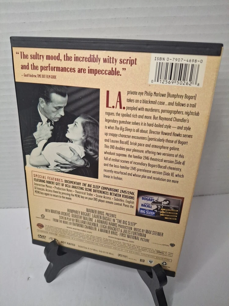 Run Time:114 min.Subtitle Language:English, FrenchGenre:Mystery / SuspenseMovie/TV Title:The Big SleepType:MovieFormat:DVDStudio:Warner Home VideoLanguage:EnglishUPC:0012569676817Sub-Genre:Film NoirDirector:Howard Hawksgtin13:0012569676817Release Year:1946