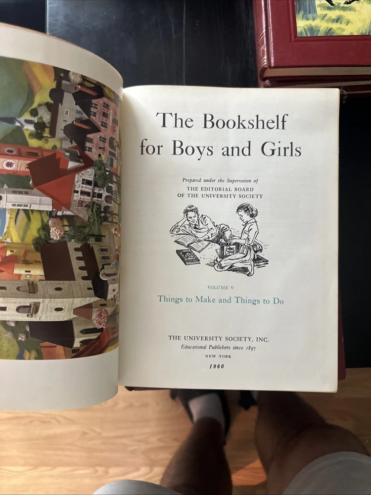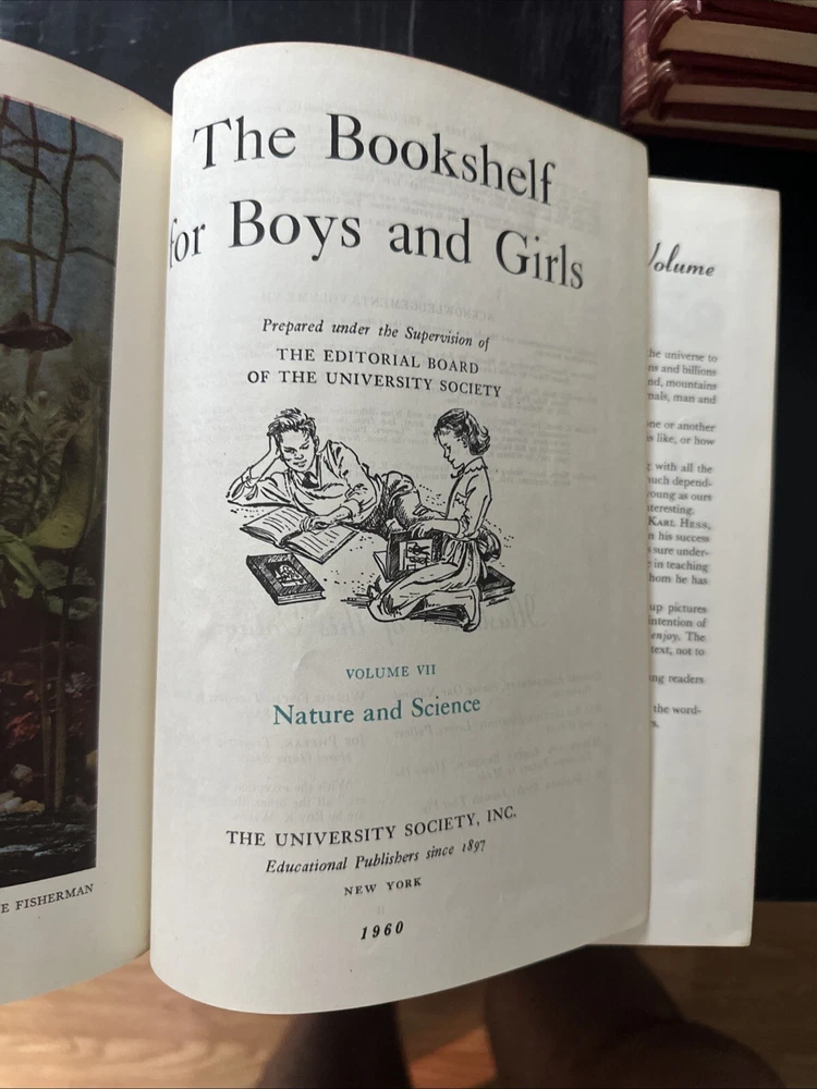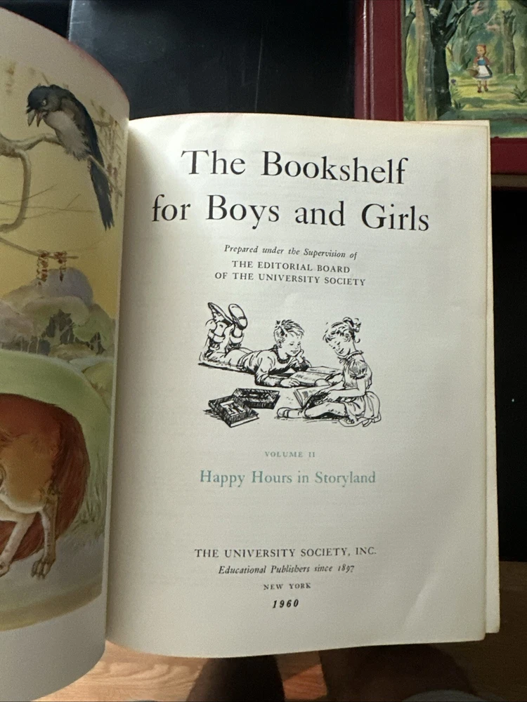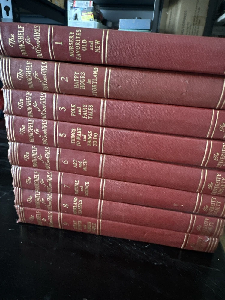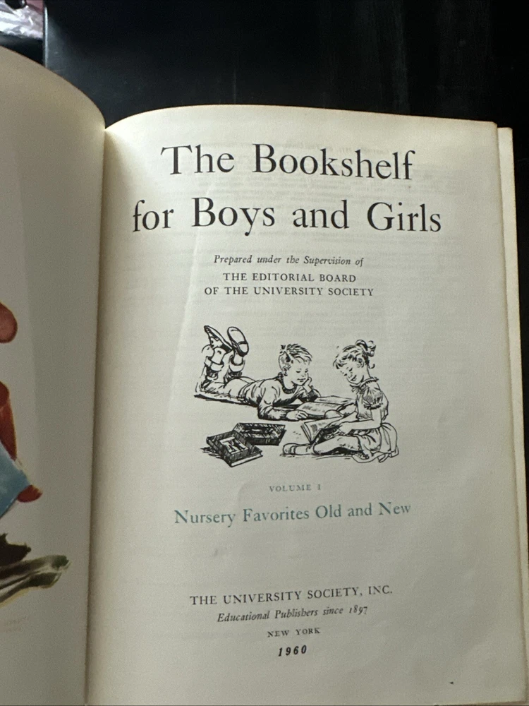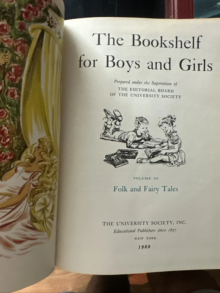 The Bookshelf for Boys and Girls Parents Guide To Volume 1-9 1959 is a collection of Folk and Fairy Tales in English. It is a hardcover book with illustrations, published by The University Society in New York in 1959. It is targeted towards children and includes volumes 1-9.