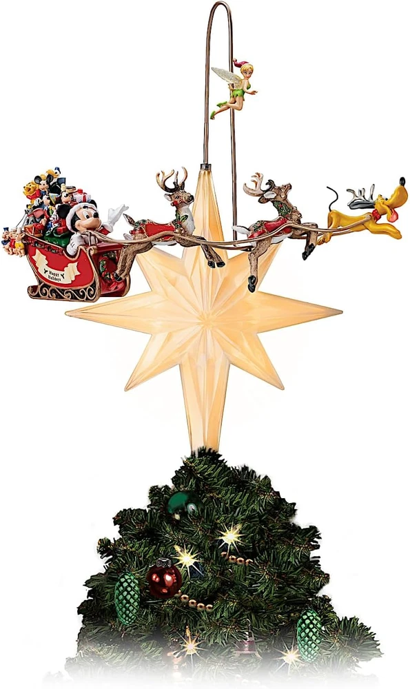This collectible Disney tree topper from The Bradford Exchange features: Capture the fond memories of Disney holidays past with this illuminated, rotating Disney tree topper, available from The Bradford Exchange Every sculpted detail is meticulously hand-cast and hand-painted by expert artisans At the flip of a switch, Tinker Bell, Mickey Mouse with his sleigh full of vintage-inspired Disney toys and Pluto actually rotate around the star Vintage toys represented include Mickey Mouse and Pluto the Pup book (1936), Donald Duck wind-up toy (1935), Dumbo drum bank (1959) and Pinocchio doll (1940) Lights up! LED lights softly glow from within the fully sculpted, multi-faceted star Simply place the star on top of your holiday tree and use the golden spring to attach Mickey, his sleigh and the reindeer 3V adapter included Edition limited to 120 casting days, so order now! Hand-numbered with matching Certificate authenticating your tree topper is an original from The Bradford Exchange Sleigh and reindeer measure 10-1/2" L; 26.7 cm L; star measures 9" H; 22.9 cm H