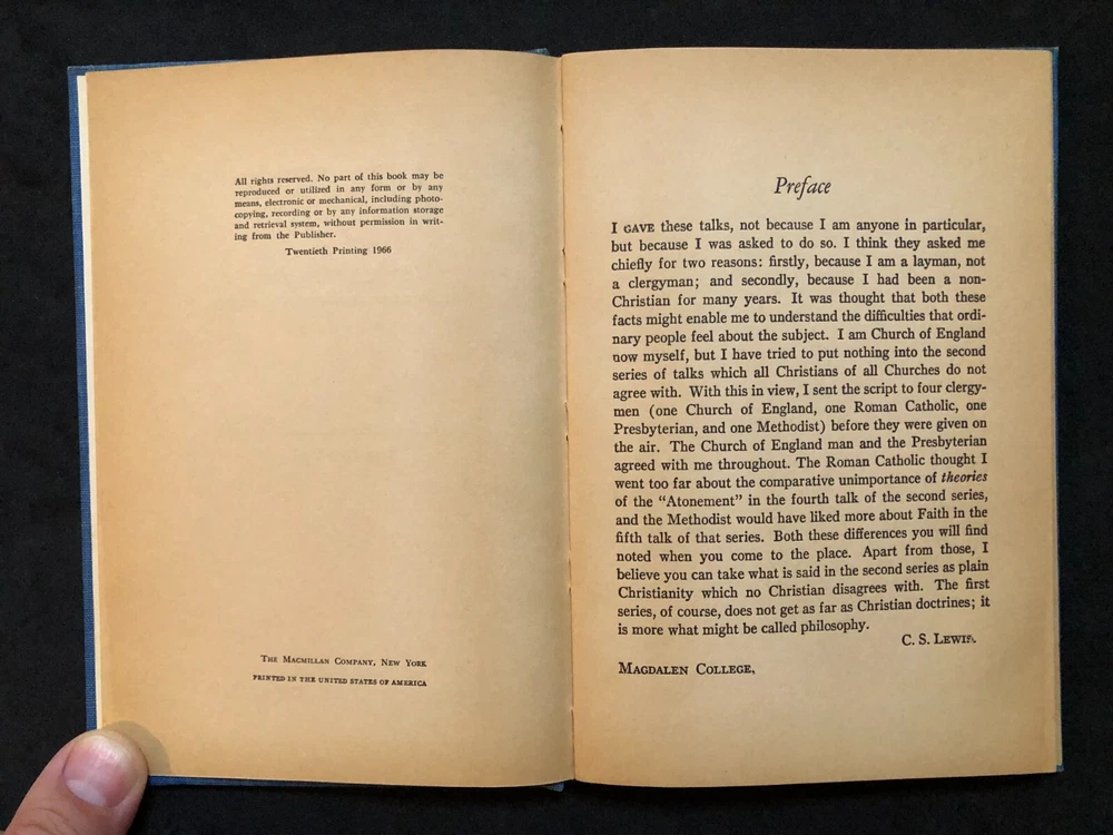 No rips, tears, folds, or writing on interior pages. Inside front cover is marked as shown. Stained / dirty cover as shown. Free USPS Media Mail shipping with tracking. Ships next day (or even sooner)! Presents a condensed, two-part version of the arguments for the reasonableness of Christian faith, dividing it into "Right and Wrong as a Clue to the Meaning of the Universe" and "What Christians Believe."
