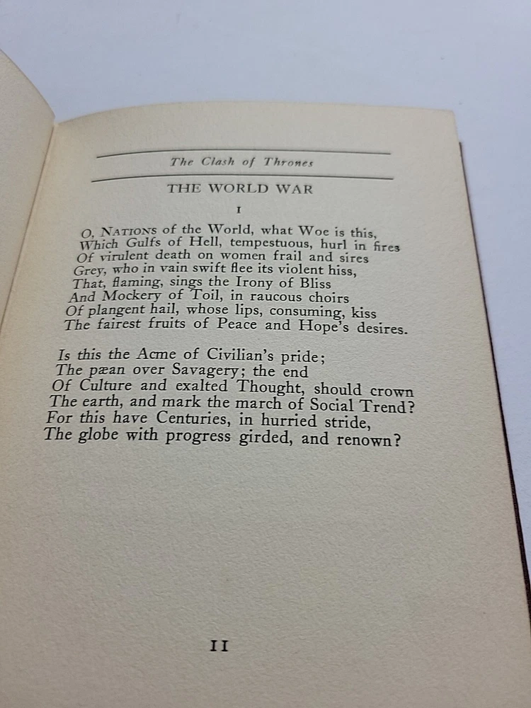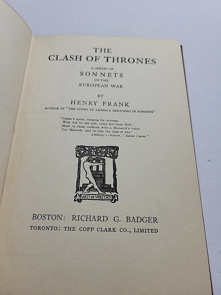 This book titled "The Clash of Thrones: A Series of Sonnets on the European War" is a rare 1915 publication by Henry Frank. It is a hardcover book with a length of 9 inches, a width of 6 inches, and a height of 0.2 inches. The book has 74 pages and is in English language. The book is a literary collection with poems on the topic of general history. It was published by Richard G. Badger and is a classic reprint. The book weighs 9.1 ounces and is a valuable addition to any book collection.