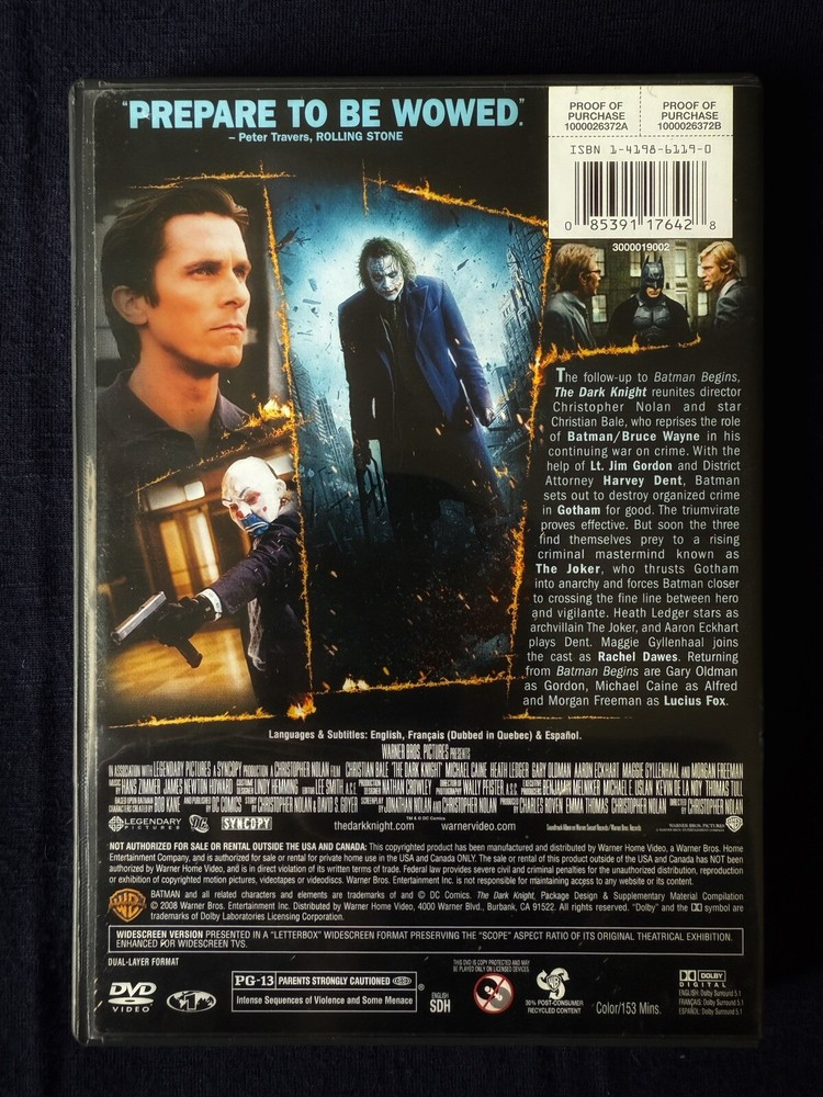 Experience the thrill of The Dark Knight (Single-Disc Widescreen Edition) on DVD. This action-packed adventure film, directed by Christopher Nolan and produced by Charles Roven, Christopher Nolan, and Emma Thomas, follows the gripping story of Batman and his battle against the Joker and his loyal followers. With a run time of 153 minutes, this PG-13 rated film features an all-star cast, including Christian Bale, Michael Caine, and Heath Ledger, and boasts stunning widescreen visuals. This DVD edition includes all the special features you could want, including behind-the-scenes footage, commentaries, and much more. Immerse yourself in the world of Gotham and enjoy the epic tale of heroism and villainy that is sure to captivate and entertain.