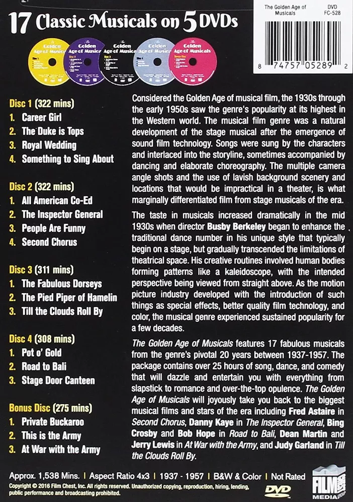 Further Details Title: The Golden Age of Musicals (5 Disc Collector's Set) Format: DVD Condition: New Number Of Discs: 5 Release Date: 08/09/2016 Actors: Frances Langford, Fred Astaire, James Cagney, Danny Kaye, The Dorseys Director: Hal Walker, Wallace Fox, Frank Borzage, Stanley Donovan, Victor Schertzinger Audio Language: English Runtime: 25 hours and 38 minutes Region Code: DVD: 1 (US, Canada...) Studio: Film Chest Certificate: MPAA Not Rated Description: Considered the Golden Age of musical film, the 1930s through the early 1950s saw the genre's popularity at it's highest in the Western world. The musical film genre was a natural development of the stage musical after the emergence of sound film technology. Songs were sung by the characters and interlaced into the storyline, sometimes accompanied by dancing and elaborate choreography. The multiple camera angle shots and the use of lavish background scenery and locations that would be impractical in a theater, is what marginally differentiated film from stage musicals of the era. The taste in musicals increased dramatically in the mid 1930s when director Busby Berkeley began to enhance the traditional dance number in his unique style that typically begin on a stage, but gradually transcended the limitations of theatrical space. His creative routines involved human bodies forming patterns like a kaleidoscope, with the intended perspective being viewed from straight above. As the motion picture industry developed with the introduction of such things as special effects, better quality film technology, and color, the musical genre experienced sustained popularity for a few decades. The Golden Age of Musicals features 17 fabulous musicals from during the genre's pivotal 20 years between 1937-1957. The package contains over 25 hours of song, dance, and comedy that will dazzle and entertain you with everything from slapstick to romance and over-the-top opulence. The Golden Age of Musicals will joyously take you back to the biggest musical films and stars of the era including Fred Astaire in Second Chorus, Danny Kaye in The Inspector General, Bing Crosby and Bob Hope in Road to Bali, Dean Martin and Jerry Lewis in At War with the Army, and Judy Garland in Till the Clouds Roll By. DVDs ARE REGION 1 UNLESS OTHERWISE STATED Missing Information? Please contact us if any details are missing and where possible we will add the information to our listing.