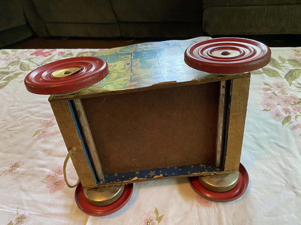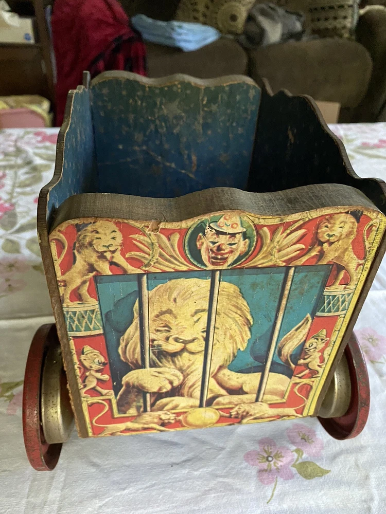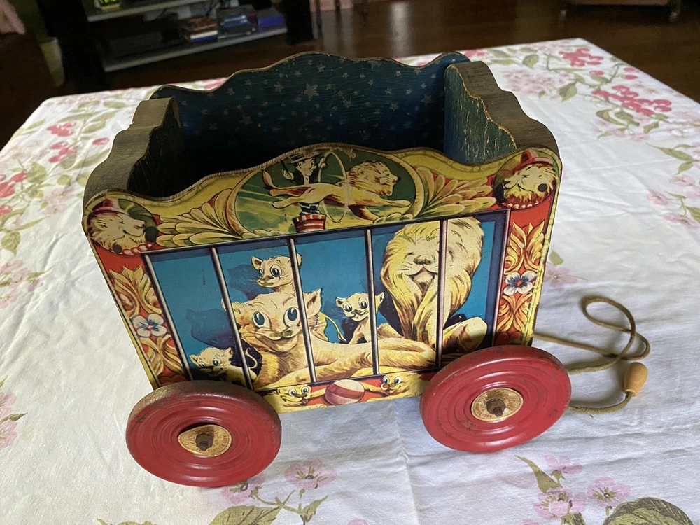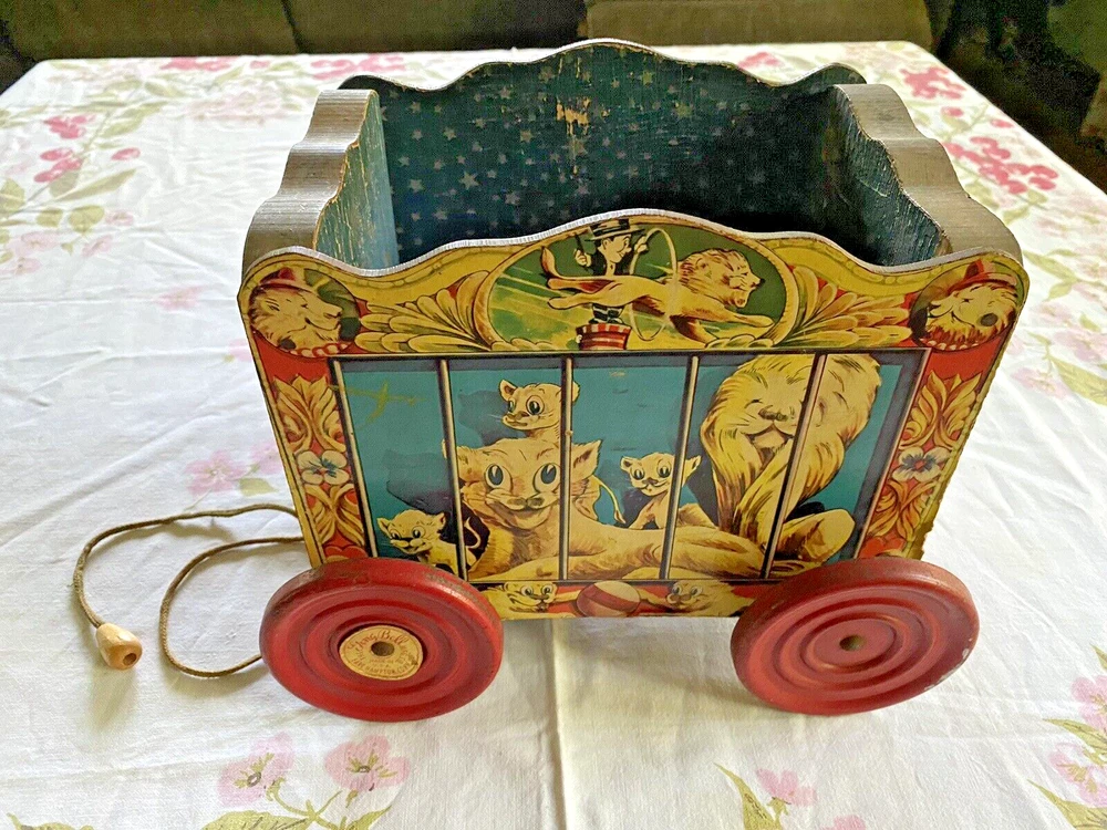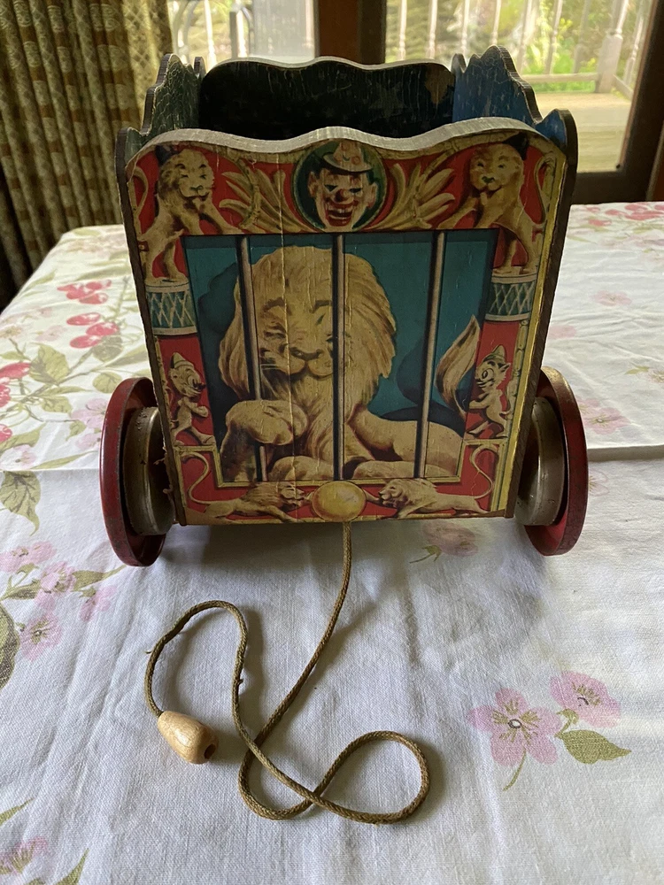 The Gong Bell Co. pull toy lions circus wagon, antique vintage