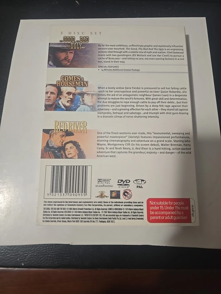 The Good, Bad And Ugly / Comes A Horseman / Red River Western Triple Pack DVD R4 is a must-have for fans of classic Western films. This box set features iconic actors like John Wayne, Clint Eastwood, and Jane Fonda, making it a timeless collection for any movie buff. With a MA15+ rating, this DVD set is perfect for those who enjoy action-packed stories set in the wild west. Get ready for hours of entertainment with these three unforgettable Westerns in one convenient package.