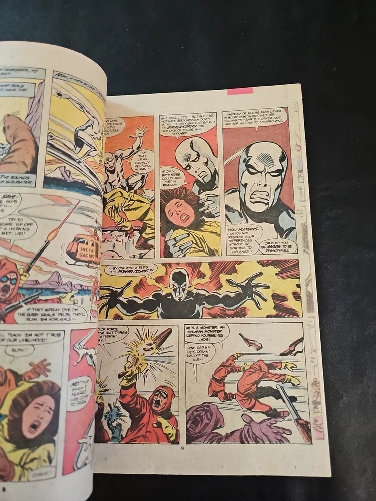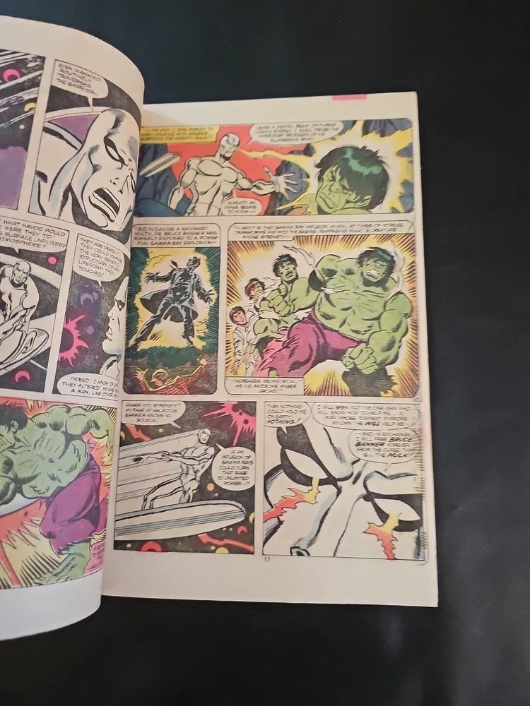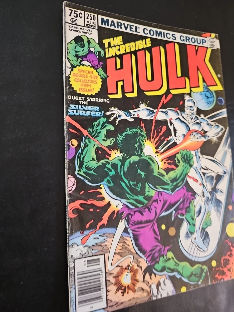 Genre:SuperheroesPublication Year:1980Tradition:US ComicsIssue Number:250Series Title:The Incredible HulkArtist/Writer:Sal Buscema, Bill Mantlo, George RoussosCover Artist:Al MilgromFeatures:DirectEra:Bronze Age (1970-83)Language:EnglishCharacter:The Silver Surfer, Collective Man, Rick Jones (Flashback), Namor, Darkstar, The Hulk (Bruce Banner), Red Guardian, Clare Mundy, Mister Fantastic, The Hulk (Bruce Banner) (Flashback), Human Torch (Johnny Storm), Captain Britain, Invisible Girl, Arabian Knight (Cameo, First Appearance), Silver Surfer, Hulk (Bruce Banner), Mary Beth, Vanguard, Sabra (Cameo, First Appearance), Galactus (Flashback), Soviet Super-Soldiers (Cameo) Crimson Dynamo, The ThingPublisher:Marvel Comics
