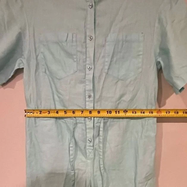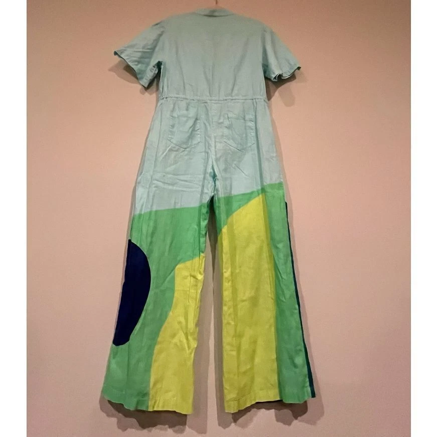 Make a statement in this unique color block jumpsuit! Features a chic mandarin collar, short sleeves, and button-front closure. The mint green base is beautifully complemented by bold geometric color blocking in teal, lime, and navy. Elastic waist provides comfort and definition. Perfect for summer brunches, art gallery visits, or creative workplace environments. The modern design offers both style and comfort. Department: Women Type: One-Piece Color: Multicolor Style: Jumpsuit Fabric Type: Woven Material: 100% Cotton, Cotton Sleeve Length: Short Sleeve Pattern: Colorblock Accents: Button Occasion: Casual, Business, Workwear Number of Pieces: 1 Piece Keywords: color block jumpsuit, mint green jumpsuit, geometric pattern, button front, mandarin collar, short sleeve, elastic waist, retro style, modern fashion, summer jumpsuit, cotton jumpsuit