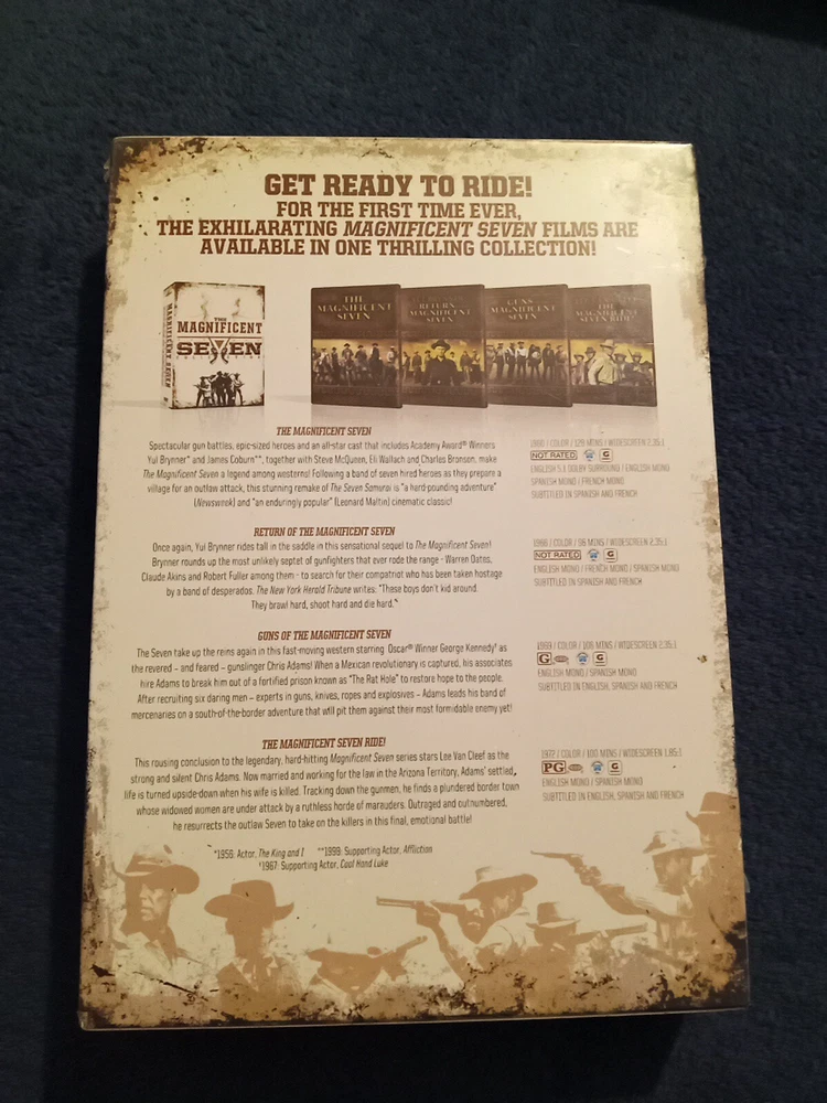 Actor:Yul Brynner, Eli Wallach, Lee Van Cleef, Steve McQueen, Stefanie Powers, George KennedyRating:NRgtin13:0883904106920Edition:4-Disc SetMovie/TV Title:Magnificent Seven 4-PackFormat:DVDDirector:John Sturges, Burt Kennedy, George MccowanRelease Year:2009UPC:0883904106920Type:MovieGenre:Westerns