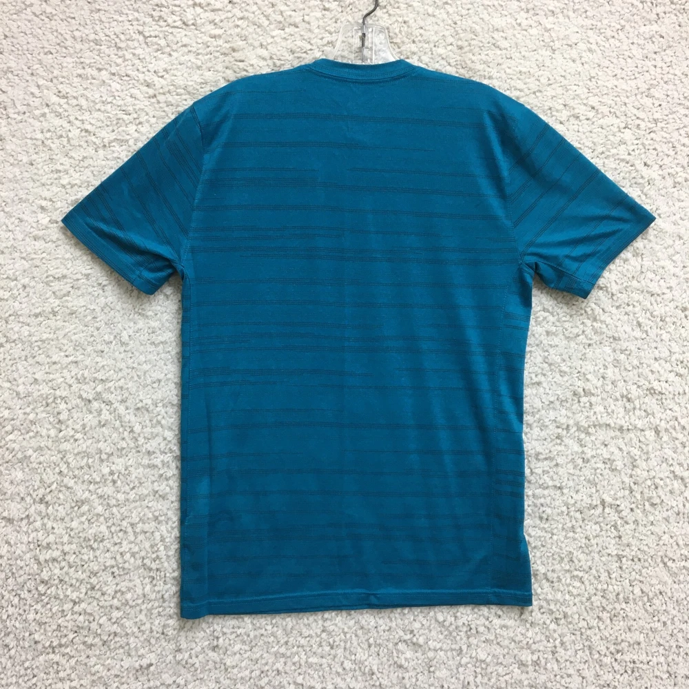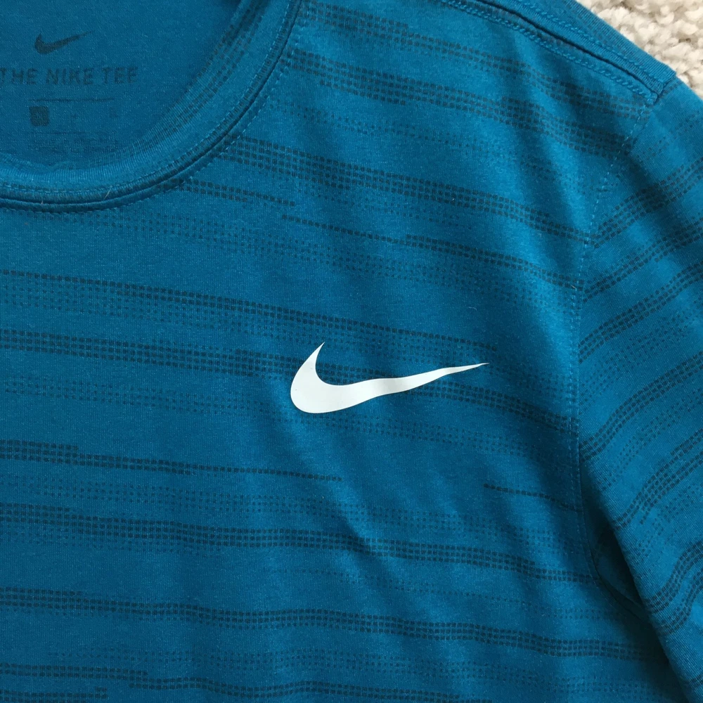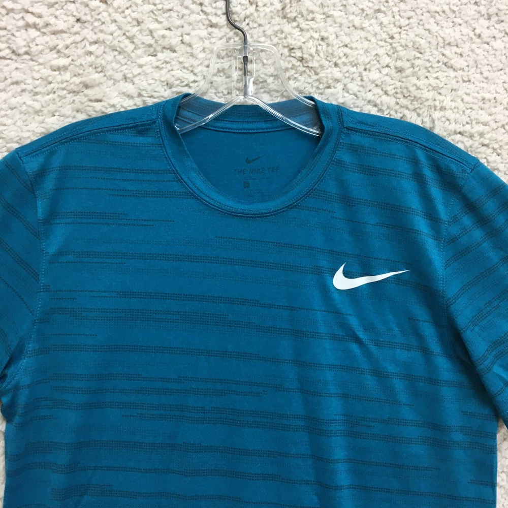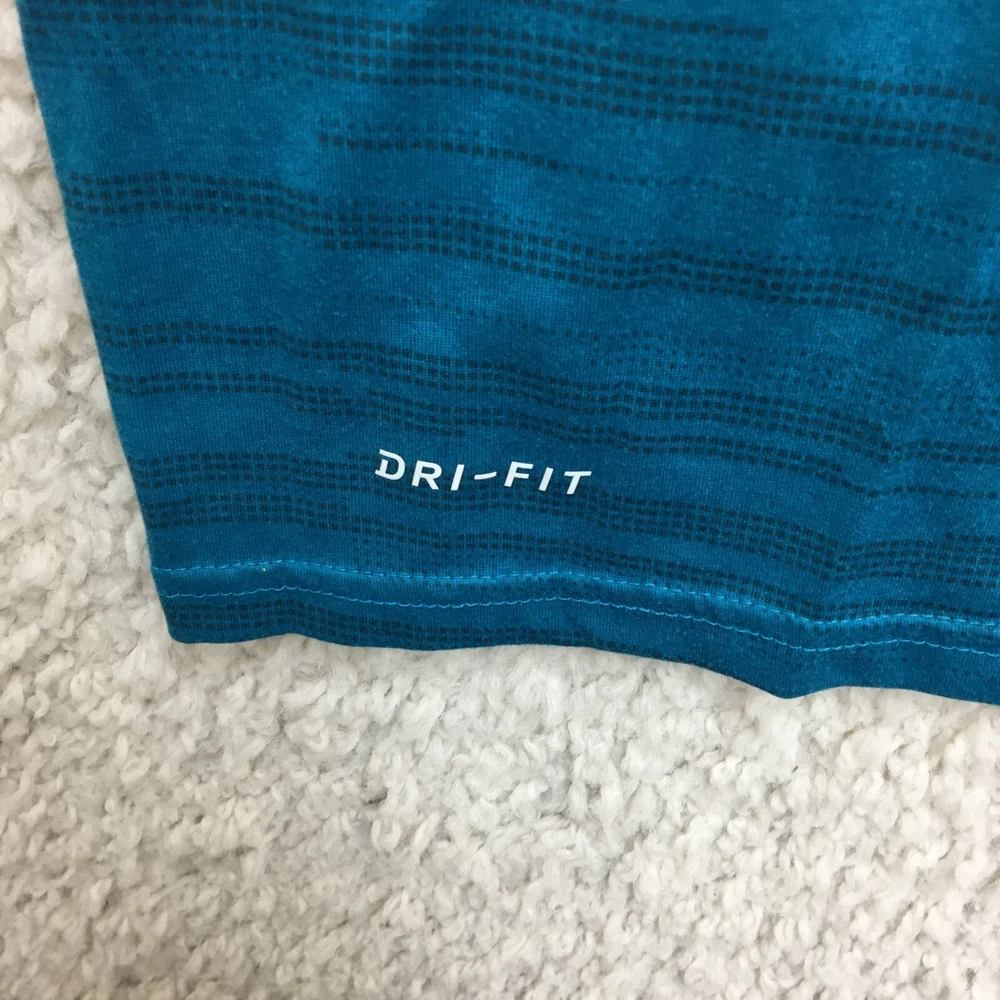 Product Line: Nike Dri-FIT Pattern: Striped Sleeve Length: Short Sleeve Size: M Material: Polyester Brand: Nike Size Type: Regular Seller Notes: “Good Used Condition. Please, See Pictures for Full Condition and Measurements.” Neckline: Crew Neck Accents: Logo Type: T-Shirt Performance/Activity: Walking Closure: Pullover Theme: Classic, Fish Occasion: Activewear Garment Care: Machine Washable Sleeve Type: Casual Sleeve Features: All Seasons, Breathable, Easy Care, Stretch Fit: Regular Style: Pullover Color: Blue Country/Region of Manufacture: Honduras Department: Men Season: Fall, Spring, Summer, Winter Fabric Type: Flannel