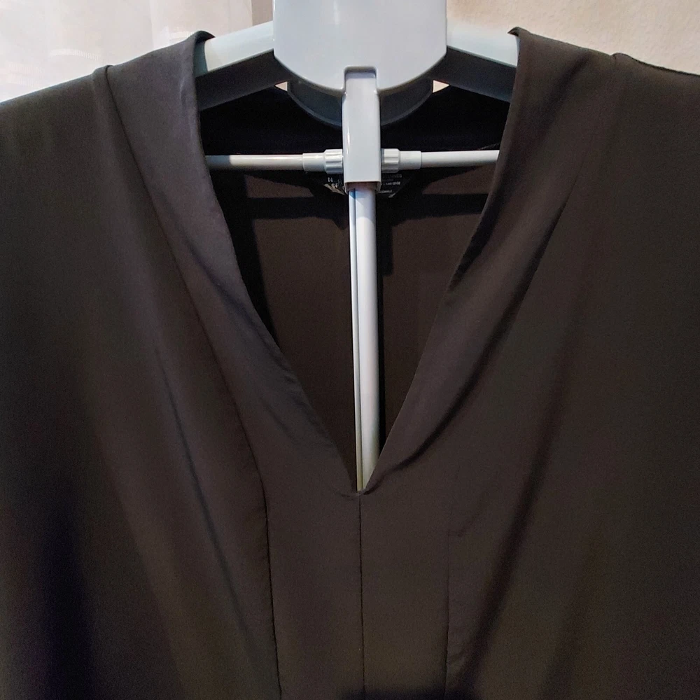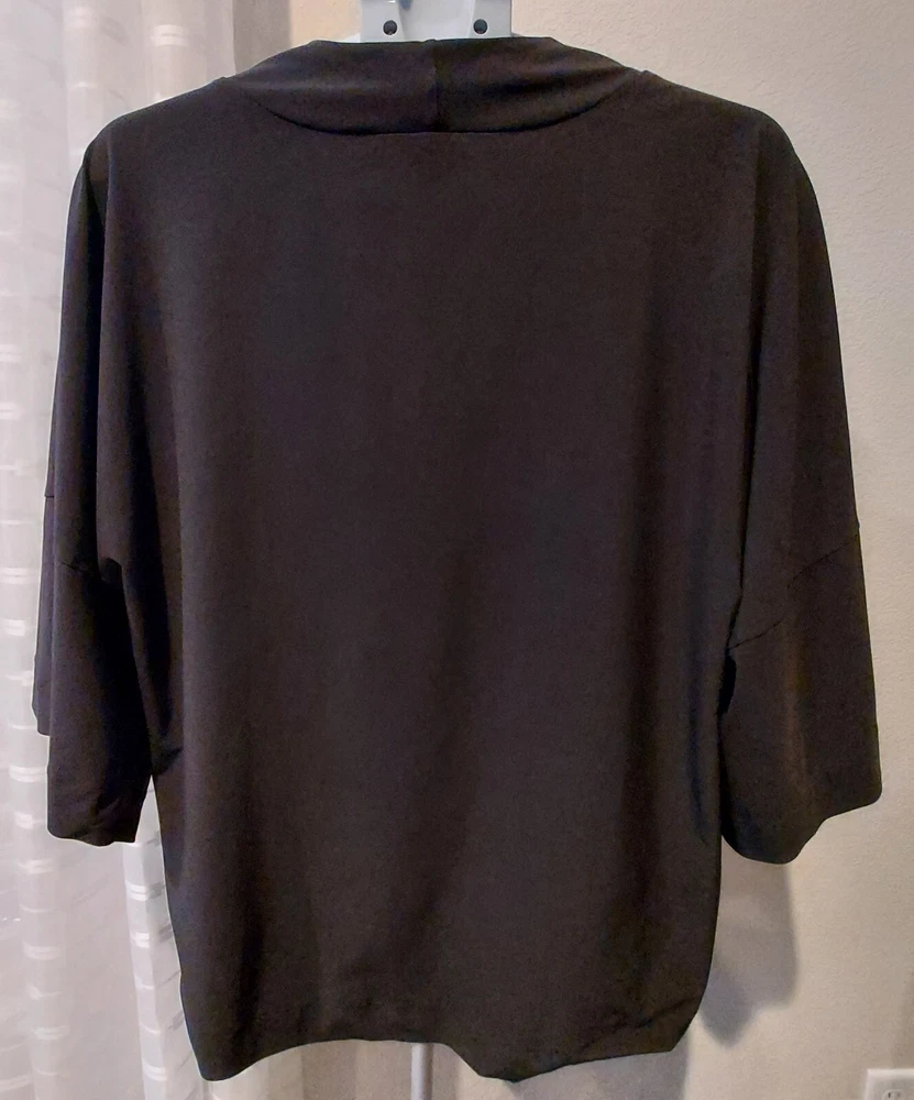 This black blouse from The North Face features a deep V-neckline and 3/4 bell sleeves, making it a perfect addition to your casual wardrobe. The inside tag is missing, so I'm unsure of what fabric it is made of, but it is lightweight and stretchy. With a classic fit and a solid pattern, this blouse is a versatile piece that can be dressed up or down. The pullover closure and kimono style add to its effortless design. Made in Haiti, this blouse is available in size medium and is perfect for women who appreciate quality clothing.