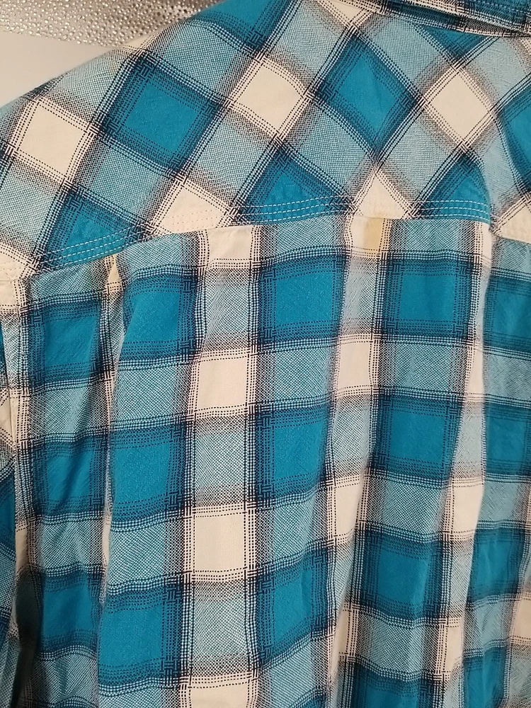 In preowned condition,see pics for details. May have washable mark on and/or by tag. Does have 2 stains below the size tag, along the back seam. See pics Top to bottom 30 inches Pit to pit 22 inches