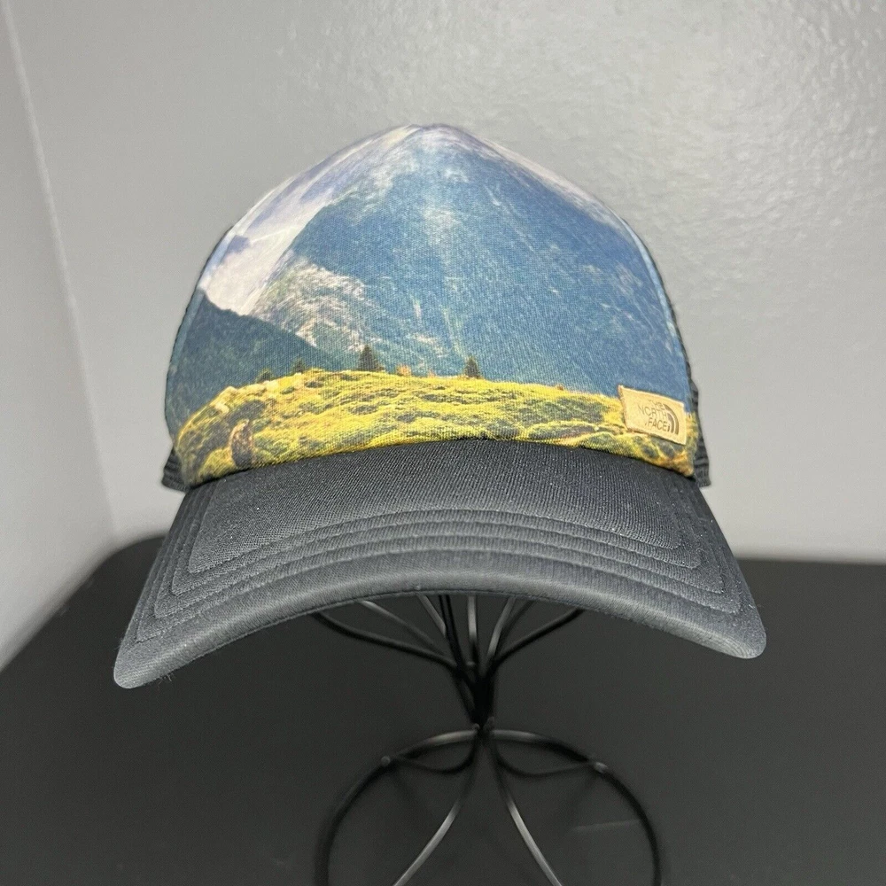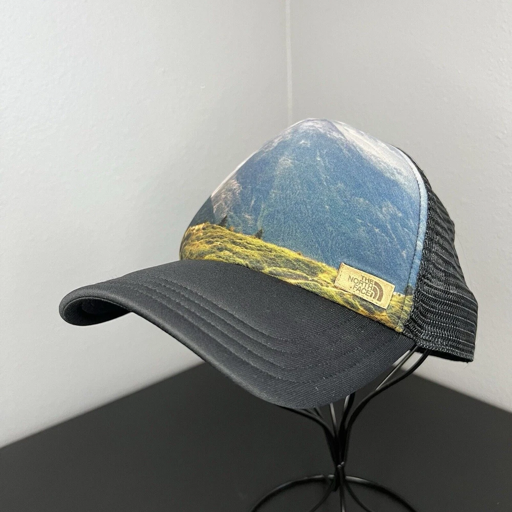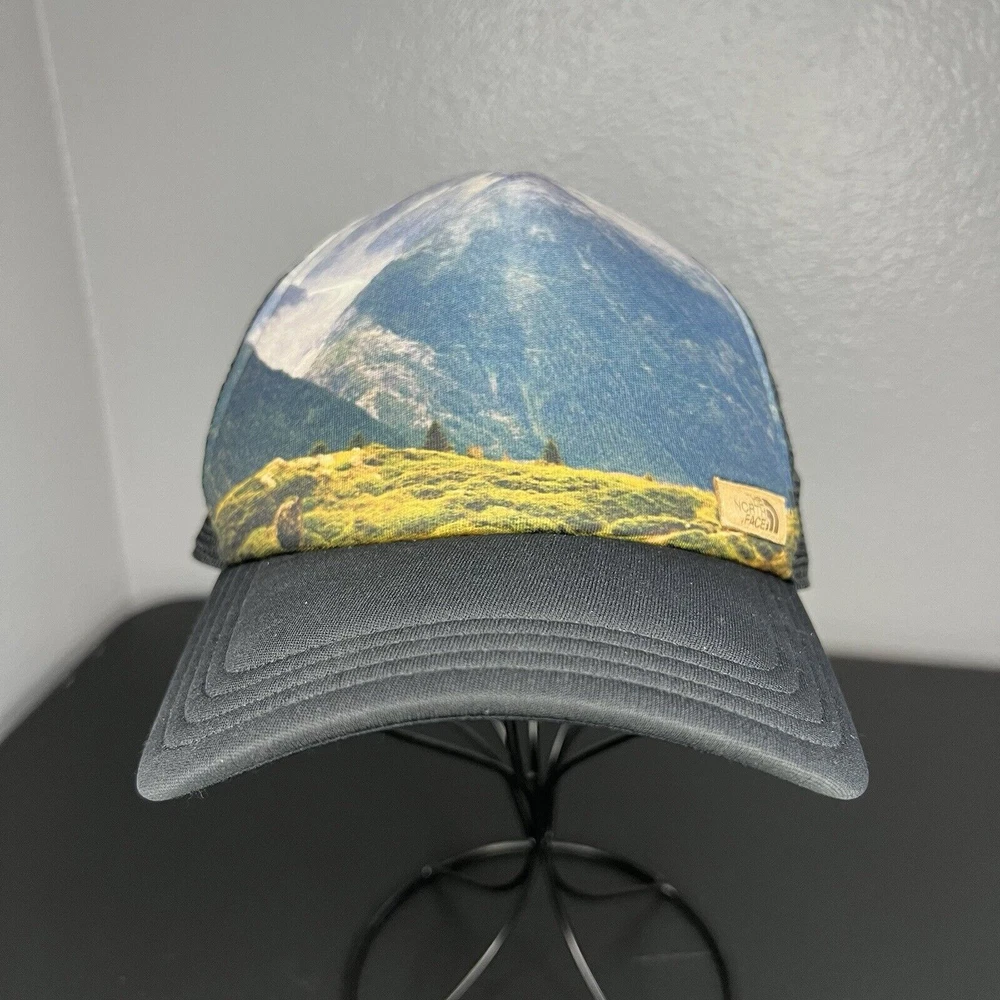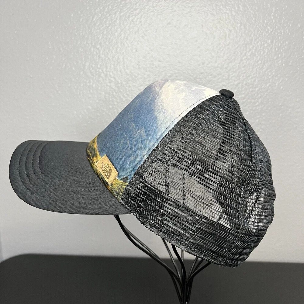 The North Face mountain scene trucker snapback hat, in good pre-owned condition. Please see the photos for more details on the item and condition.