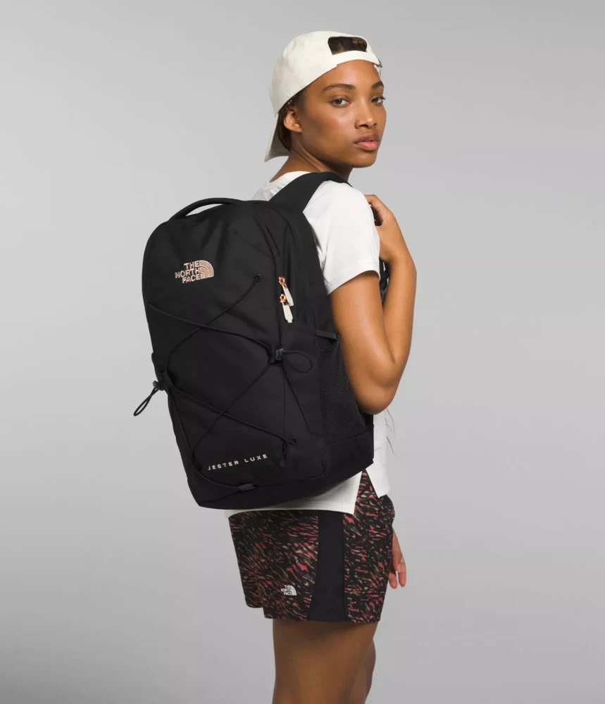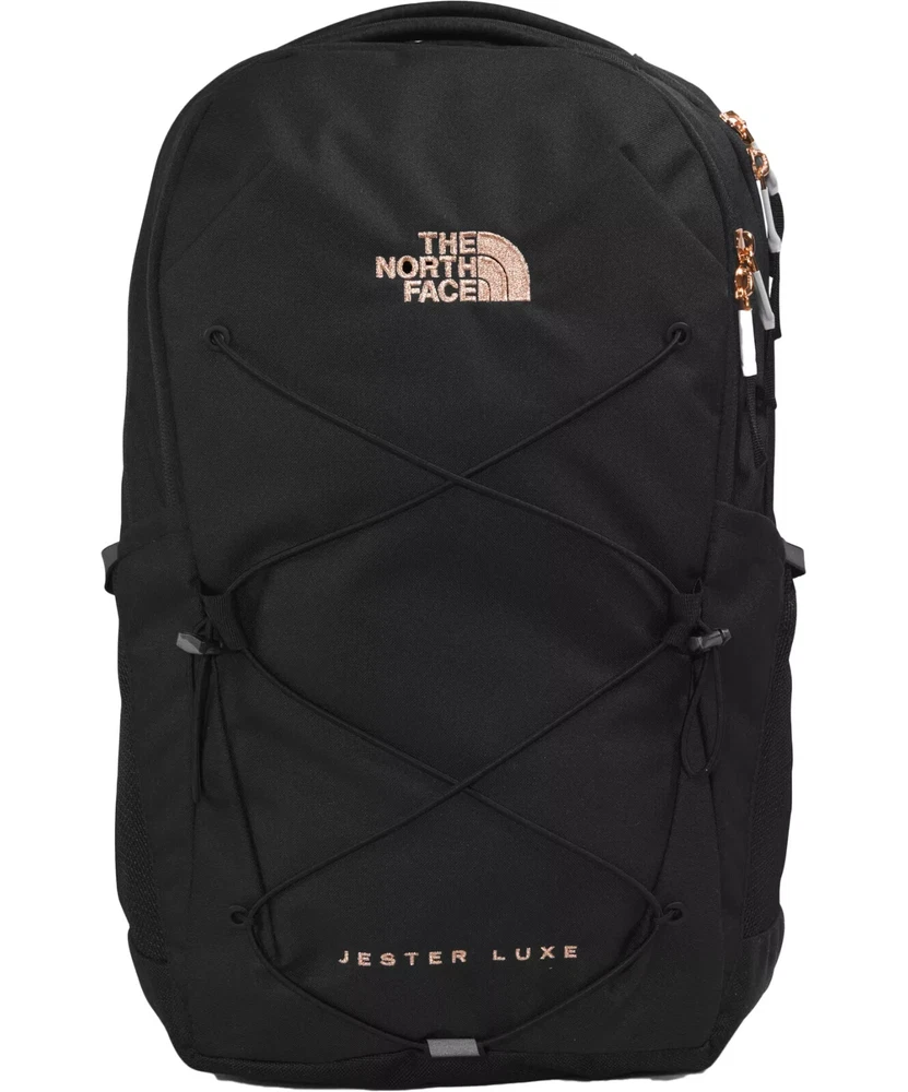 The North Face Women's Jester Backpack, Color: TNF Black/Brnt Crl Mtllc The Women's Jester pack has a padded laptop sleeve and simplified organization, and it can stand up completely unsupported. It’s also endorsed by the American Chiropractic Association. FIT & DESIGN: Women's specific fit Huge main compartment holds all the books and binders needed for a day on campus Padded laptop sleeve protects laptop from bumps and falls A FlexVent™ suspension system features a flexible yoke built from custom injection-molded shoulder straps; an unbelievably comfortable, padded back panel; and a highly breathable lumbar panel, all certified by the American Chiropractic Association Sternum strap Two webbing top handles allow for both a convenient opening experience and a perfectly balanced carry when the pack is by your side Pack stands on its own for easy loading and unloading of essentials Front compartment simplifies organization for the modern user while maintaining essential features for storage such as secure-zip pockets, a tablet sleeve and a key fob 360-degree reflectivity enhances visibility while you’re commuting Two external water bottle pockets ADDITIONAL DETAILS: Laptop Sleeve: 12.75" X 11" (32.4 Cm X 27.9 Cm) Dimensions: 11'' x 6.75'' x 17.25'' (27.9 cm x 17.1 cm x 43.8 cm) Volume: 27 Liters Brand : The North Face Country of Origin : Imported
