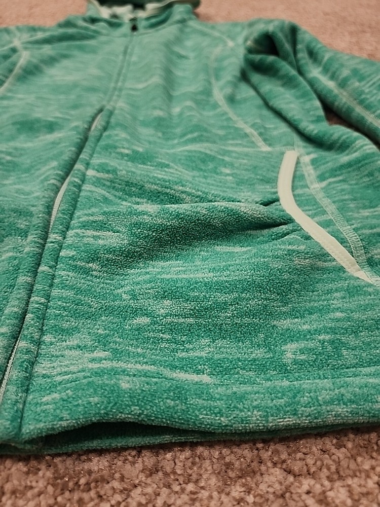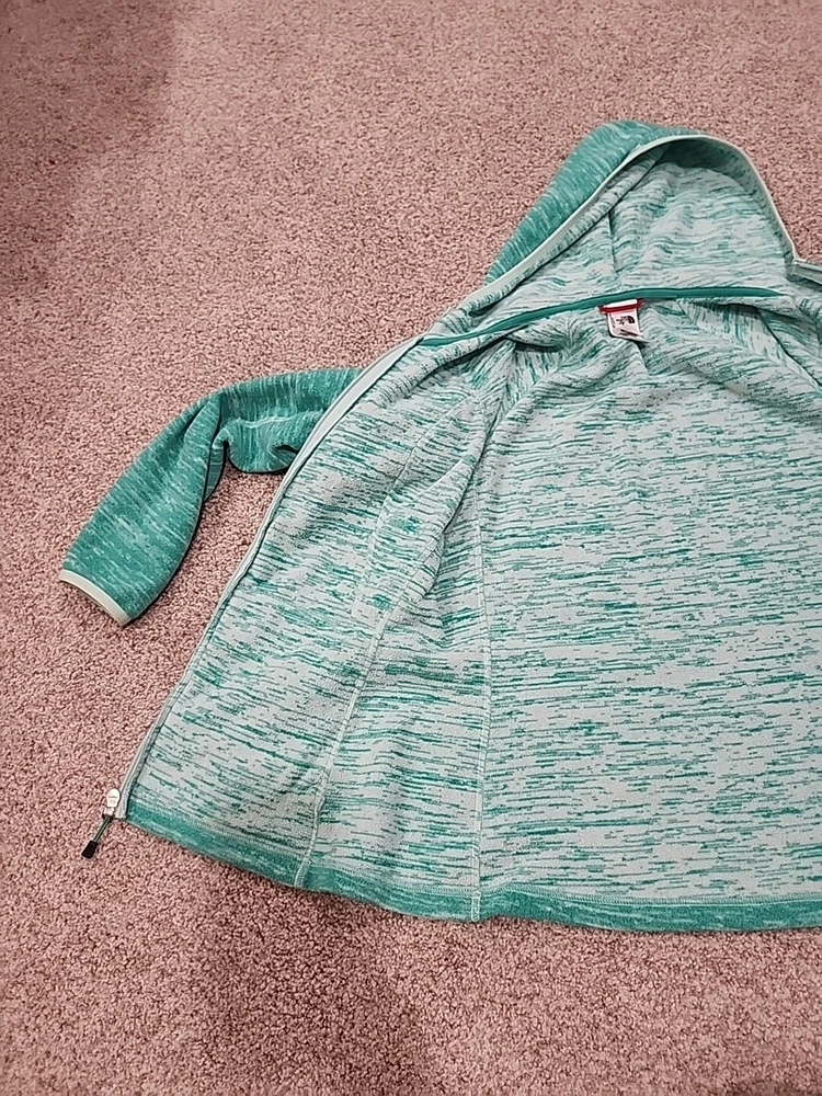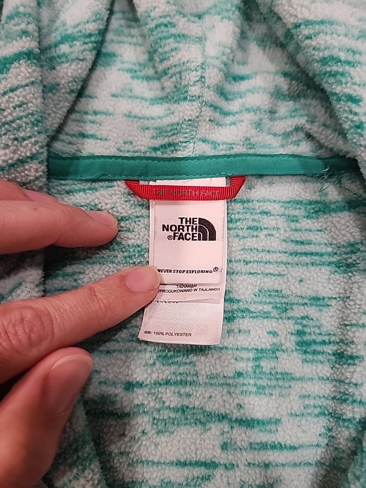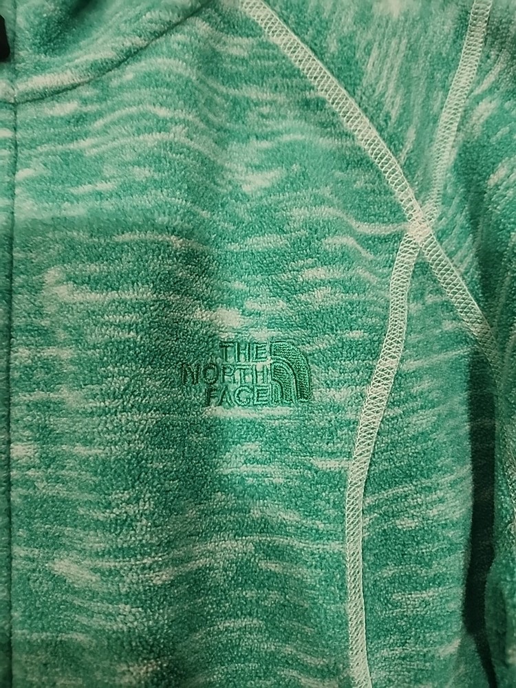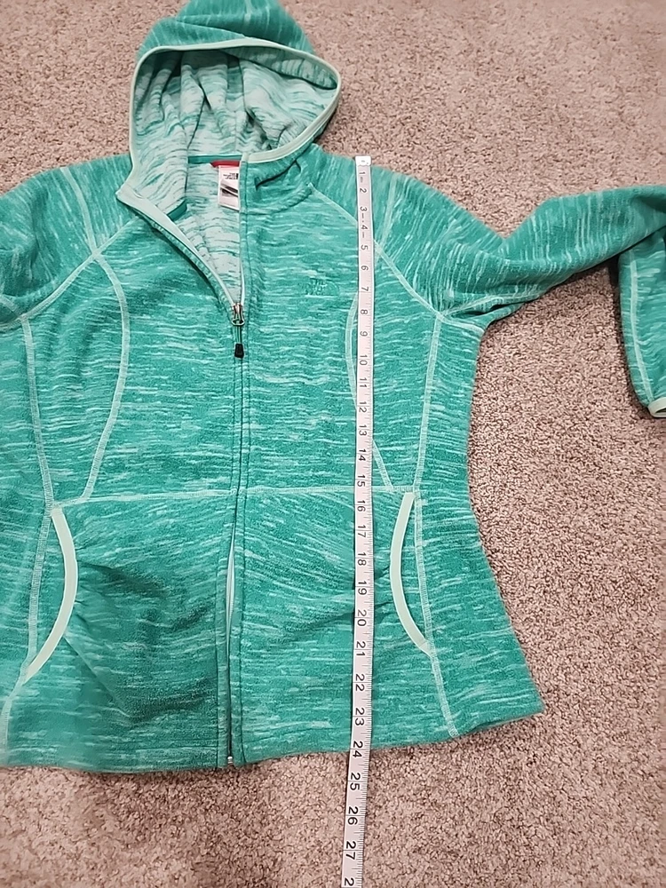 Jacket in excellent condition with no rips or stains. Measurements on photos. This North Face jacket for women is a must-have for any outdoor activity. The hooded and full zip design makes it perfect for fall, winter, and spring seasons. The jacket is made of 100% polyester and features a fleece fabric type with a solid pattern. It comes in a beautiful sea foam green color with a zipper and logo accent. The jacket is machine washable and has a regular fit. It is perfect for travel and casual occasions. The long sleeve and short length make it suitable for any height. Get this basic jacket now and enjoy the comfort and style it provides.