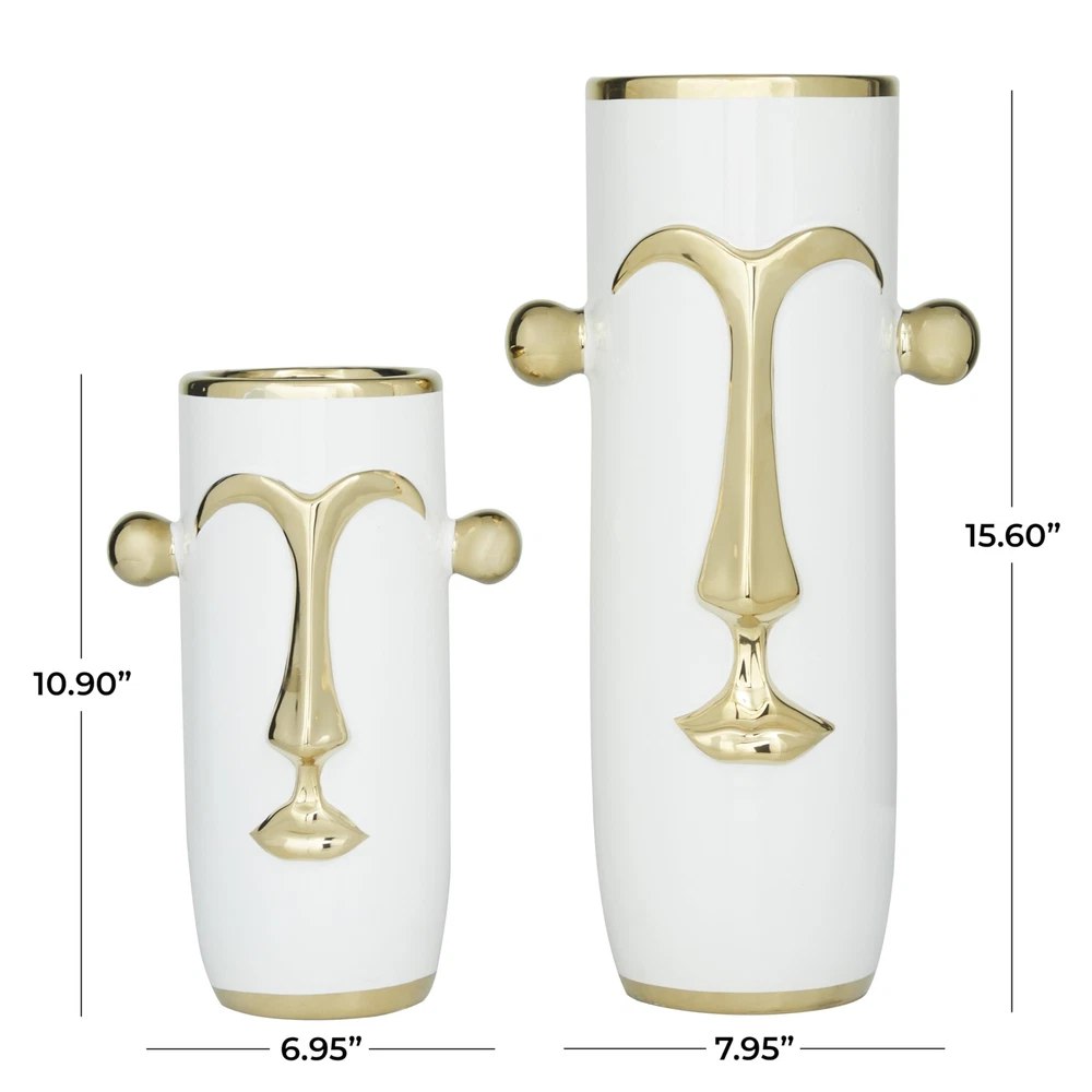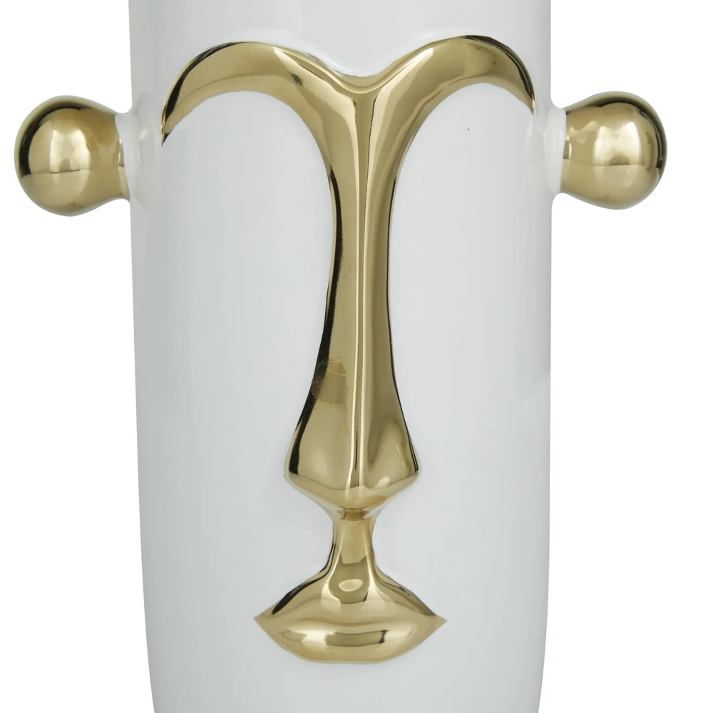 This vase is perfect for displaying orbs filler and twigs, as well as filling up any negative space against an open surface space. Create depth and form onto your space by displaying this beautifully crafted vase on you counter or table top. Create a lavish focal point vase piece on your living rooms and hallways as you style this set of tribal face vases with long-stem flowers and leaves. Designed with felt or rubber stoppers at the base that prevent scratching furniture and table tops, as well as sliding around. This item ships in 1 carton. Stoneware vase makes a great gift for any occasion. Suitable for indoor use only. This item ships fully assembled in piece. This white colored stoneware vase comes as a set of 2. Modern style. Vases have 5.75 in, and 4.95 in mouth openings. MODERN THEME Inspired by sleek elegance and clean lines, a minimalistic design offers effortless luxury with monochromatic tones and bold, angular structures MADE OF STONEWARE Product is made of pure stoneware for durable display WHITE AND GOLD POLISHED FINISH These ceramic face vases feature a high polished white and metallic gold finish FEATURES ROUND ABSTRACT VASE This white and gold flower vases showcase an abstract style tribal face with knob-shaped ear handles on the side and stylish metallic gold top and bottom rimmings 2 PIECES CONVINIENTLY SIZED Each white ceramic vase measures 7.95L x 6W x 15.60H , 6.95L x 5.10W x 10.90H inches, and collectively weighs 7.49 lbs