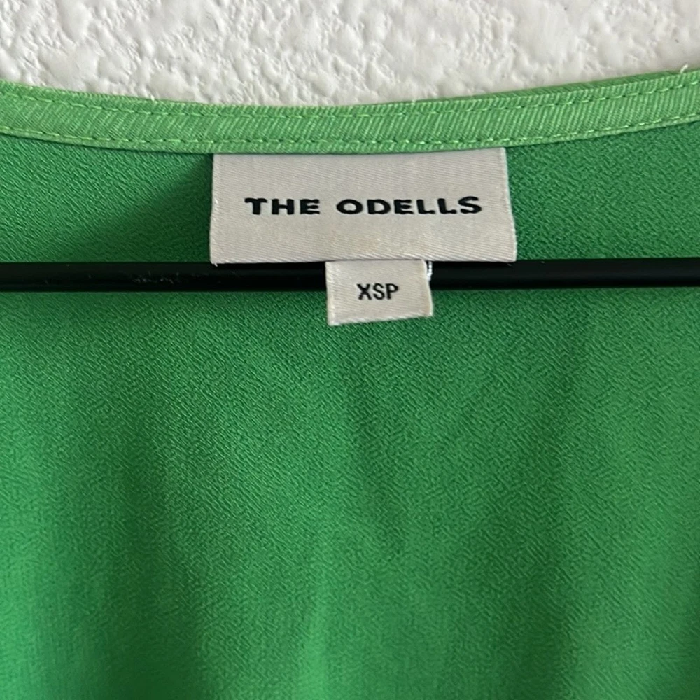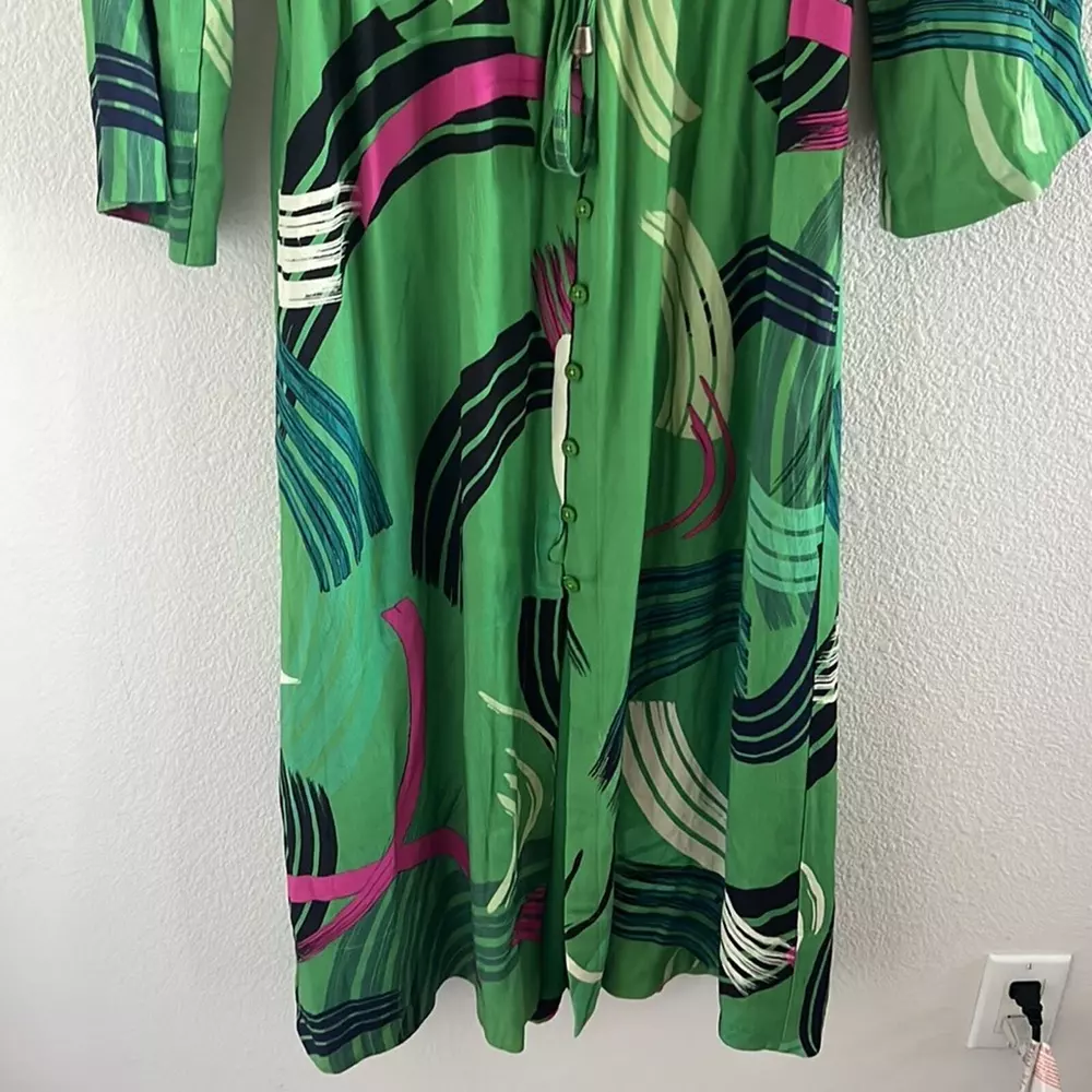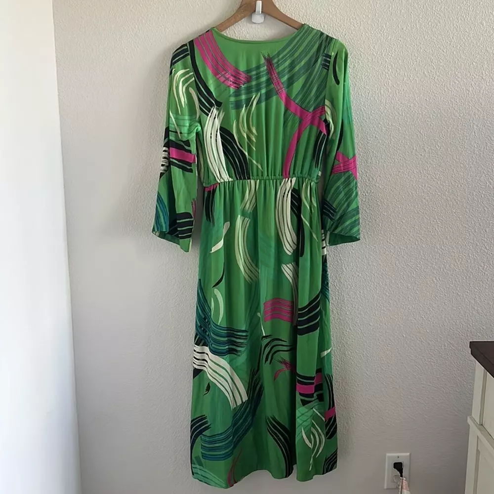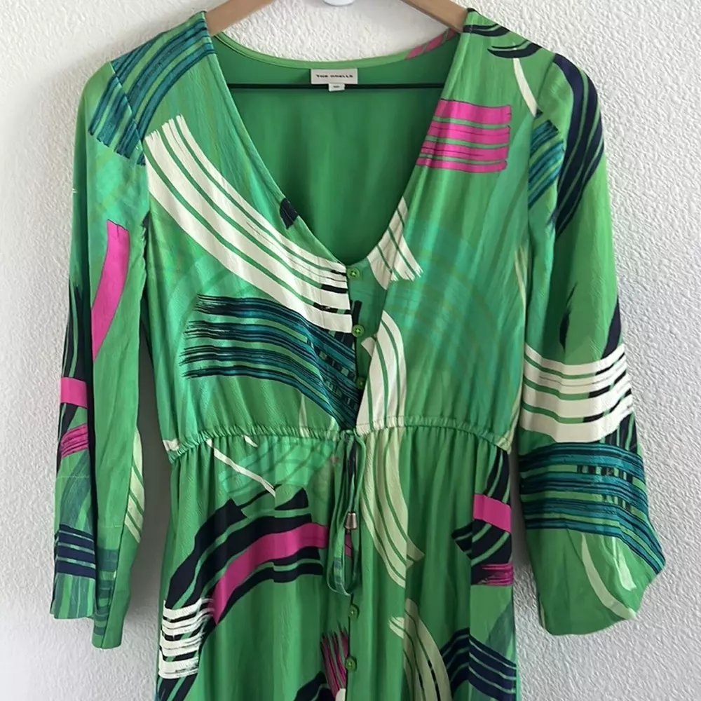 The Odells Paloma Paint-Swiped Maxi Dress Anthropologie Kimono Green Preowned. Size: XS Petite Underarm-to-underarm: 18" Length: 47.5" Front Slit: 16" Measurements are approximate and taken flat. 60% Tencel/40% Rayon with 100% Polyester Lining ITEM 0629 tropical, maxi, kimono, boho, green, anthropologie dress, tropical, aloha, vacation