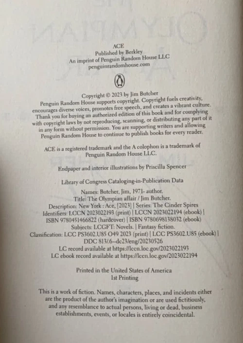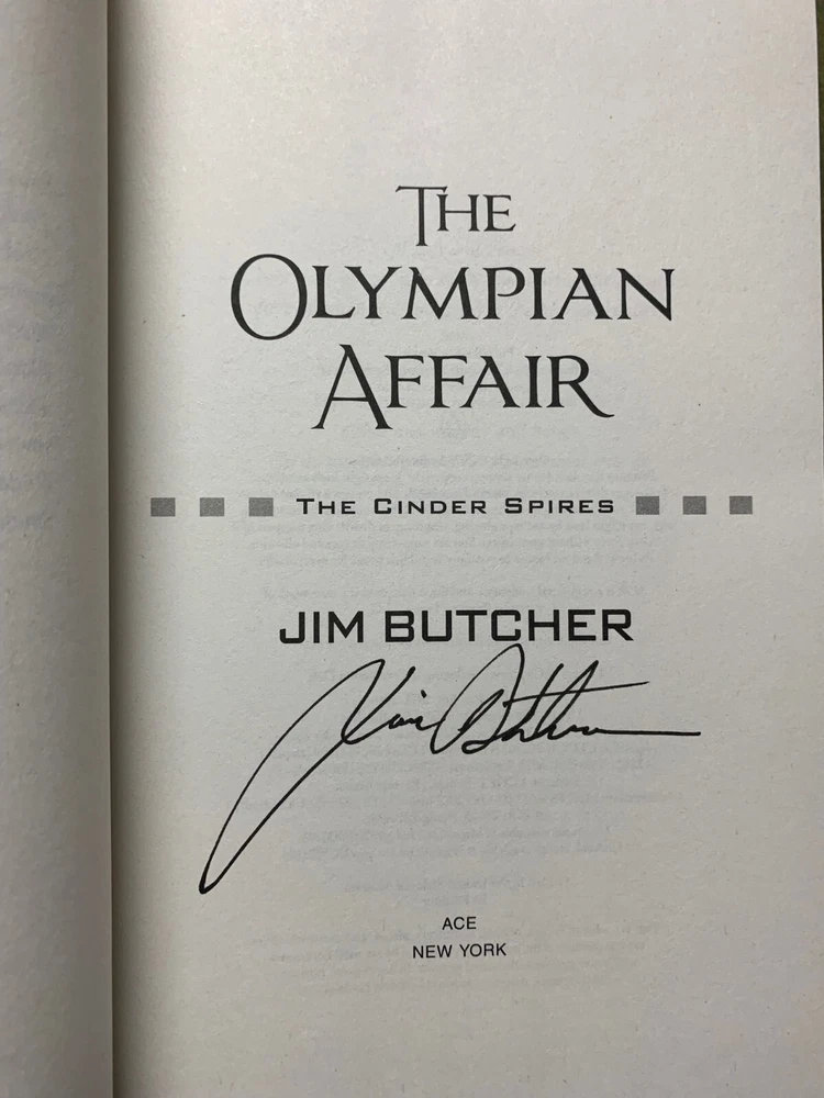 The Olympian Affair Signed on the Title Page by Jim Butcher First Edition, First Printing Book 2 of The Cinder Spires Series The first was The Aeronaut's Windlass Hefty volume with beautiful endpapers Brand new and unread Shipping includes insurance