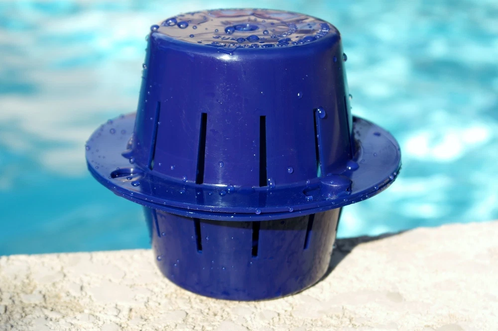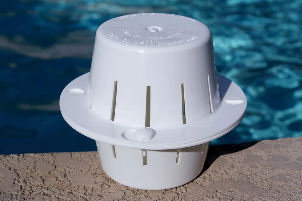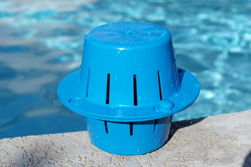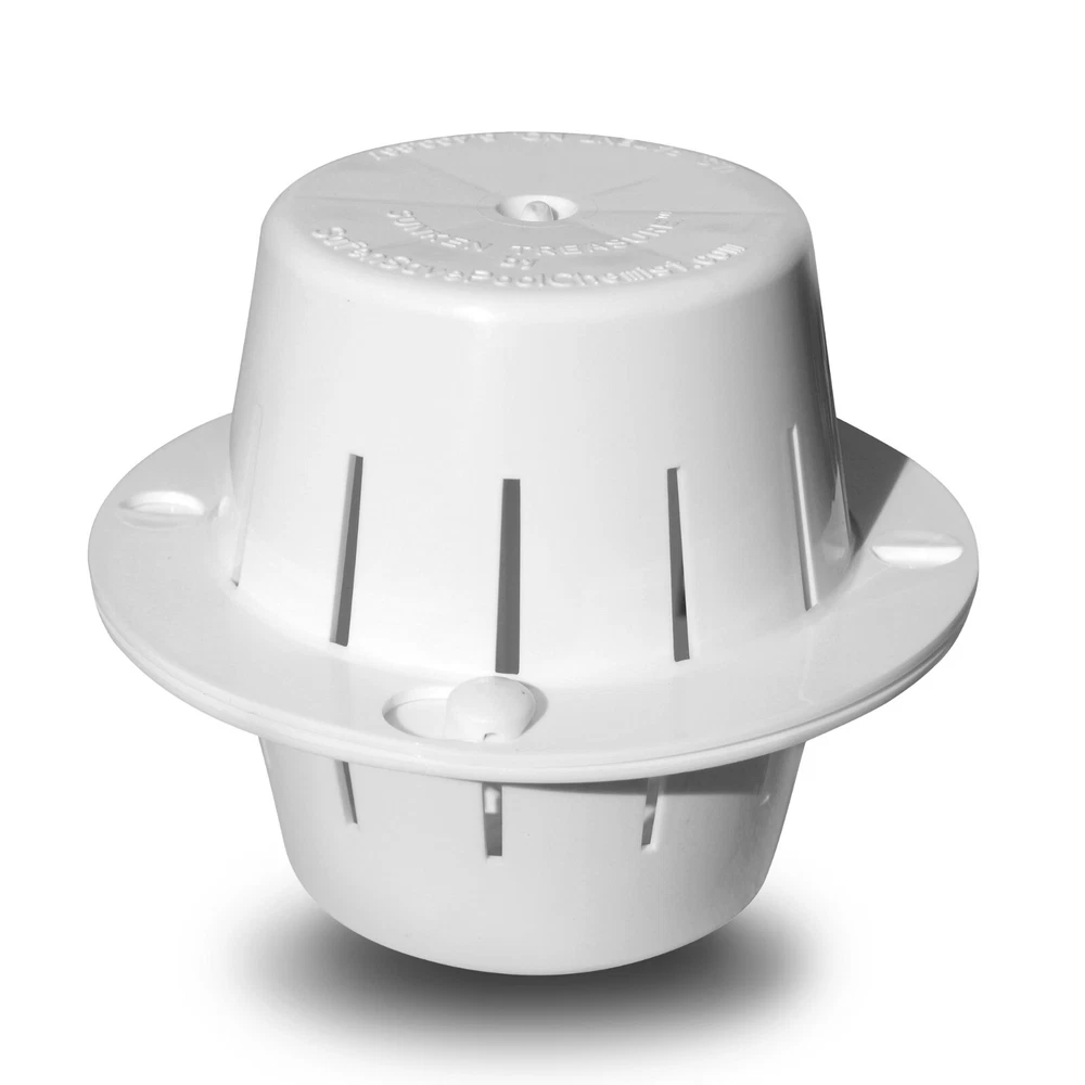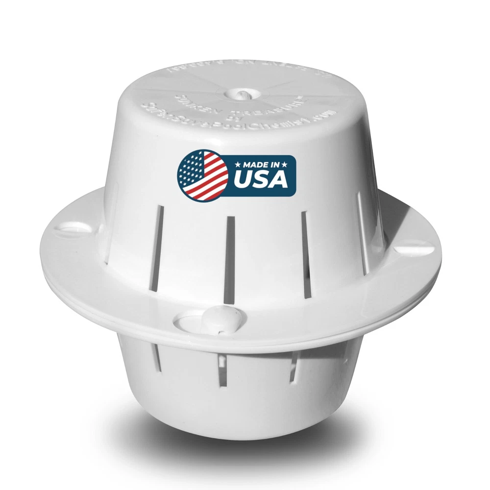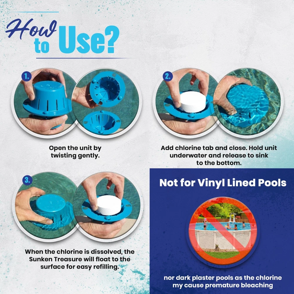 DITCH THE FLOATER! While a floating pool chlorinator is cheaply made and quickly breaks, leaks, sinks and fails, the Sunken Treasure chlorine dispenser lasts for many years and uses half the chlorine to clean your pool water more effectively! SINK YOUR CHLORINE! Chlorine tablets dissolve 2 to 3 times slower at the bottom of your pool. Sink your chlorine tabs inside the Sunken Treasure dispenser which holds the chlorine tabs inside. Always deep underwater, ALL the chlorine is used in your water -- not evaporating into the air like with a floating chlorine dispenser. This means pool owners use about HALF the chlorine of a floating chlorine dispenser! One chlorine tab in the Sunken Treasure is equal to 3 to 4 tabs in a floater! DISPENSER LASTS LONGER: Stop buying a cheap chlorine tablet floater that wastes chlorine and fails in one season! This dispenser stays deep underwater cleaning your pool water – not getting scorched by the sun! No more replacing the cheap pool tablet floater every season. Pays for itself in one season because you use so much less chlorine. ENJOY YOUR POOL AGAIN: Enjoy the beauty of your pool without the chlorine smell! Get back to having beautiful blue sparkling water in your pool. Get you pool clean, not smelling like chlorine! GUARANTEED: Get yours today, Risk Free. If you are not fully satisfied, you may return it for a full refund. Just contact us if there is a problem. We are committed to your 100% satisfaction. Made in the USA. NOTE: NOT RECOMMEND FOR DARK PLASTER POOLS OR VINYL LINED POOLS AS THE CHLORINE MAY CAUSE PREMATURE BLEACHING. Tired of replacing cheap floating dispensers? Spending too much money on chlorine? Check out the Sunken Treasure! How Does It Work? The Sunken Treasure houses a chlorine tablet and takes it deep under water. There it cleans the water thoroughly and efficiently, at the bottom of the pool. The unit dispenses all the chlorine. None of the chlorine is wasted into the air as with floating dispensers. When the chlorine tablet is dissolved, the unit floats to the water surface for convenient refilling. Why Is It Better Than a Floating Dispenser? With traditional floating chlorine dispensers, much of the chlorine is wasted since it is sitting on the top of the water with much of the chlorine being released as harmful toxic fumes into the air. With the Sunken Treasure, however, ALL of the chlorine is utilized in the pool water since it is fully submerged, releasing chlorine and cleaning the water from the bottom up. This eliminates the need to stuff a floating dispenser with as many chlorine tabs as will fit. For the Sunken Treasure only 1 chlorine tablet is recommended, 2 tablets for a unit in the deep end of a diving pool. Will it Work for My Pool? The Sunken Treasure chlorine tab dispenser was designed and engineered to work well in pools and spas all across the country. It also works very well in extreme heat climates with low or high humidity. For best results, follow instructions provided with the unit. Not recommend for dark plaster pools or vinyl lined pools as the chlorine may cause premature bleaching. How many Sunken Treasure units are enough for my pool? For a typical play pool or spa (12,000 gallons or less) - 1 Sunken Treasure For larger pools (over 15,000 gallons) 2 units For very large pools (over 25,000 gallons) 3 units