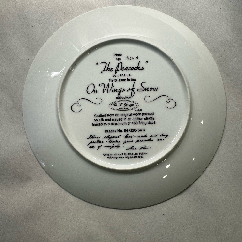 This beautiful collector plate from Bradford Exchange features a stunning design of peacocks on wings of snow, created by Lena Liu in 1991. The plate is made of high-quality ceramic and has a round shape with a diameter of 8.5 inches. It is a perfect addition to any decorative collection and can be displayed on any occasion. The plate is vintage and was manufactured in the late 20th century, specifically in the 1990s. It is an art pottery piece and has a production technique of pottery. The culture of the plate is unknown, but it is believed to be of Bird origin. The plate is perfect for collectors of vintage decorative items and can be used as a display piece or as a functional plate.