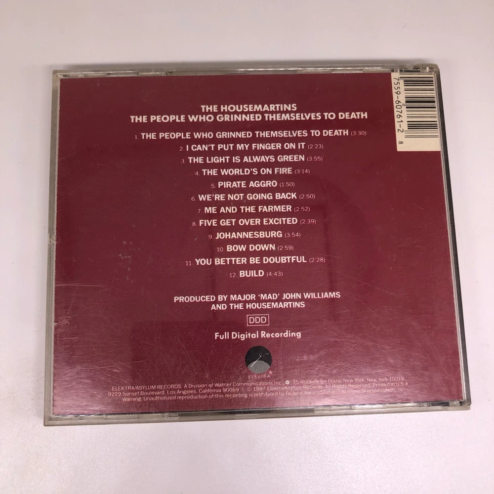 Style: Alternative/Indie Producer: Major "Mad" John Williams gtin13: 0075596076128 Genre: Alternative, Rock, Rock & Pop Format: CD Type: Album Artist: The Housemartins Release Title: The People Who Grinned Themselves to Death Inlay Condition: Good (G) Case Condition: Good (G) Run Time: 38 min. UPC: 0075596076128 Record Label: Elektra (Label) Seller Notes: “Guaranteed to play fine, some minor scratches and blemishes can be expected. Cases may be damaged.” Case Type: Jewel Case: Standard Release Year: 1990 CD Grading: Good (G)
