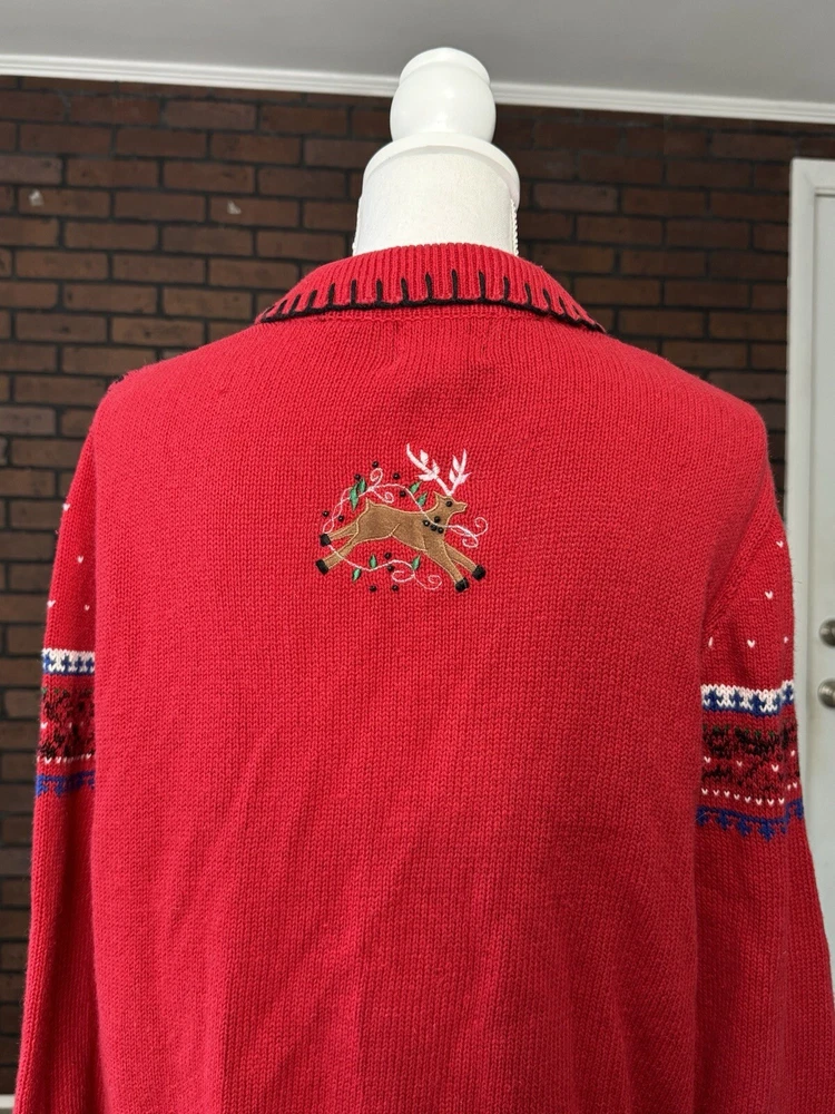 The Perfect Vintage Christmas Sweater With Mitten Pockets And Reindeer Petite XL Insanely cute and detailed vintage Christmas Sweater Cardigan The little mittens are the pockets!! Size - Petite XL All items are vintage and due to their nature will sometimes have imperfections or flaws. I will do my best to list any I see but cannot guarantee perfection. Hearts reindeer fair isle