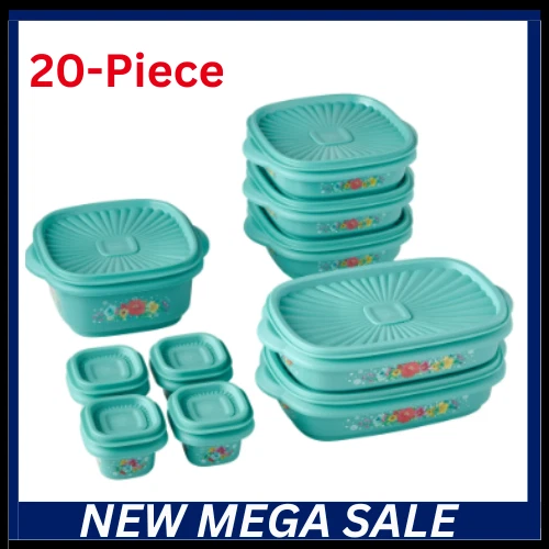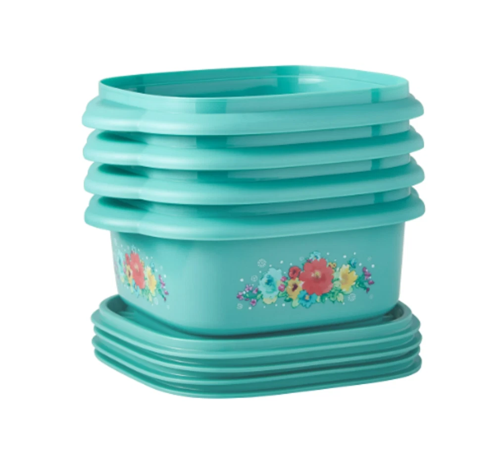 20-Piece Food Storage Set with BPA-Free Plastic Containers and Lids, Breezy Blossom Product details 20-Piece Food Storage Set will become your home kitchen staple for everyday cooking and baking. This convenient food storage pack comes with twenty assorted containers with coordinating lids including four 1/2-cup square containers, three 3-cup square containers, two 4-cup rectangle containers, and one 5-cup square container. These food storage bowls ensure that your leftover foods or prepared meals are kept fresh and safe in the refrigerator or freezer. In addition to providing ideal storage, these containers and their lids are microwave safe, so you can heat your food without switching to another bowl, plate, or other kitchenware for convenience and less waste. The lids are easy to seal- simply press down in the center for a snug, airtight fit that allows for great food storing results. Constructed with BPA-free plastic, these food storers provide long-lasting durability and won't break or get damaged when dropped. Their teal color featuring one of Ree's signature Breezy Blossom floral designs makes them a great stylish addition to your kitchen and perfect to use as serving bowls, both indoors and outdoors, or even to bring along on your picnics. After use, these containers and lids are dishwasher safe for a quick and easy clean up. Meet Ree: Ree Drummond is a NY Times Best Selling Author, TV personality, social media phenom, and the woman behind the popular Pioneer Woman lifestyle blog that started it all. She's also a lover of butter, basset hounds, Ethel Merman, her hunky, cowboy husband Ladd, and their four kids. Her casual country style and delicious recipes have made her a go-to for all things cooking and entertaining. About this item 20 assorted containers with lids - (4) 1/2-cup, (3) 3-cup, (2) 4-cup, (1) 5-cup Great for storing leftovers or meal preps in the fridge or freezer Microwave safe so you can heat food without switching kitchenware Easy to seal lids provide a snug airtight fit onto containers BPA-free plastic construction is durable and won't break or damage when dropped Specification Features Airtight, With Lid Material Polypropylene Food Storage Jar & Container Type Food Storage Containers