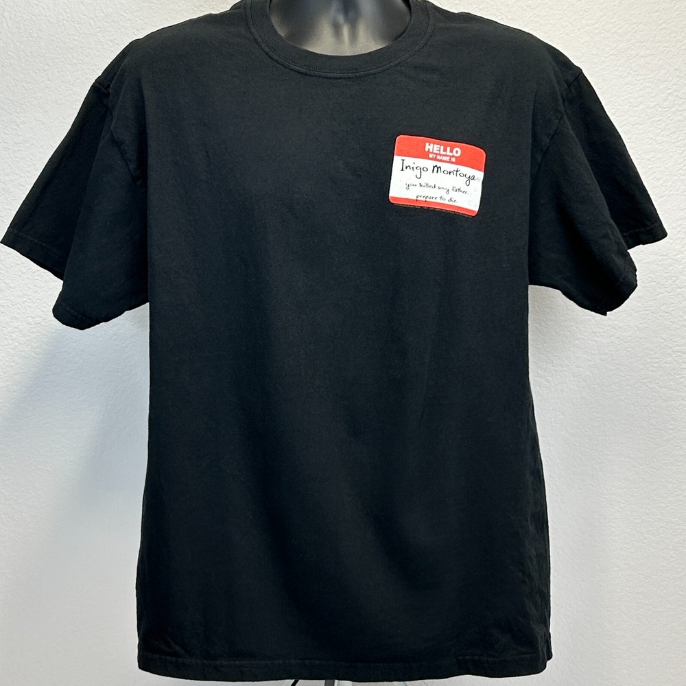 The Princess Bride Inigo Montoya T Shirt Mens Large Name Tag 2007 Officially Licensed Film Movie Black M&O Knits Graphic Tee CONDITION: In gently used condition - no flaws noticed. See photos. SIZE AND MEASUREMENTS: Mens/Unisex Large Width 21.5" - Underarm to underarm Length 27.5" - Measure from top of shoulder at the edge of collar to the bottom of the shirt