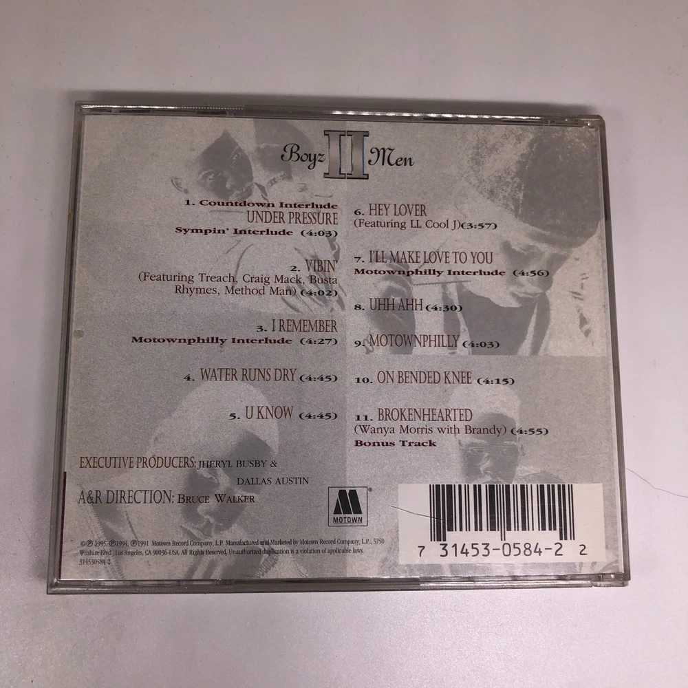 Release Title: The Remix Collection Genre: Dance & Electronica, R&B & Soul CD Grading: Good (G) Seller Notes: “Guaranteed to play fine, some minor scratches and blemishes can be expected. Cases may be damaged.” UPC: 0731453058422 Release Year: 1995 Type: Album Artist: Boyz II Men, Craig Mack, Busta Rhymes, Treach, Brandy Norwood, Method Man, Sherree Ford-Payne, Ll Cool J Record Label: Motown Format: CD Case Type: Jewel Case: Standard Style: Dance gtin13: 0731453058422 Case Condition: Good (G) Inlay Condition: Good (G)