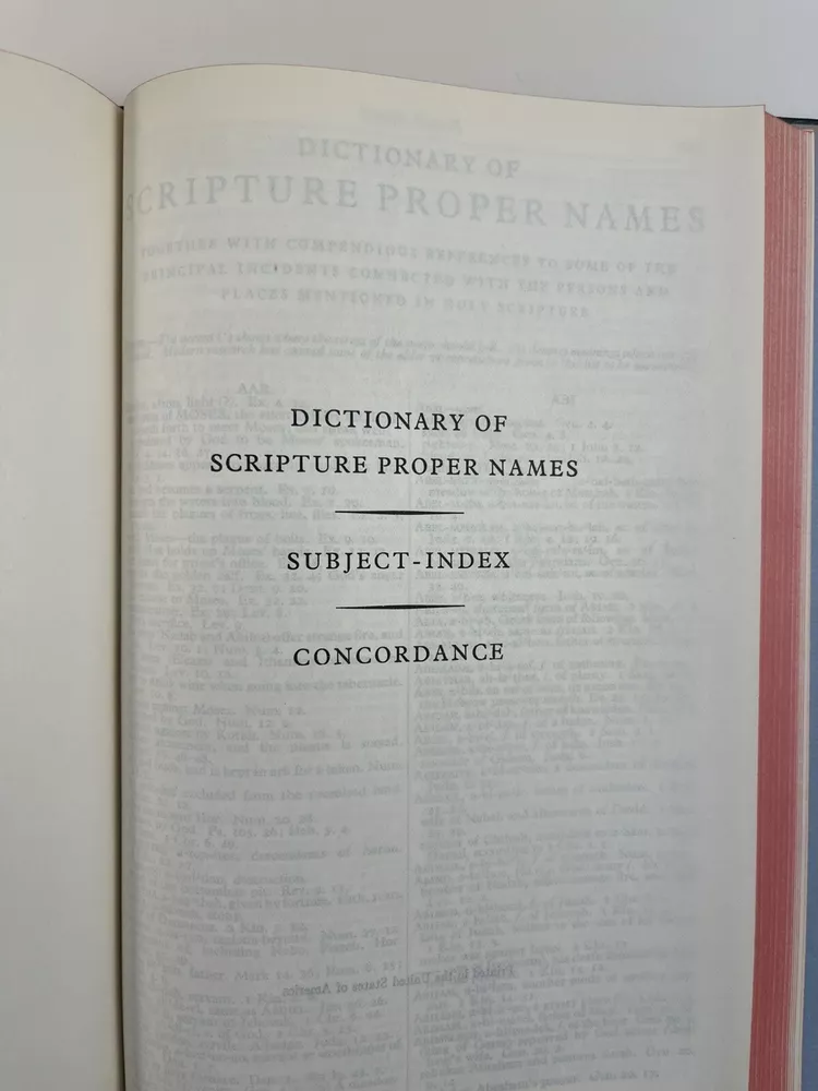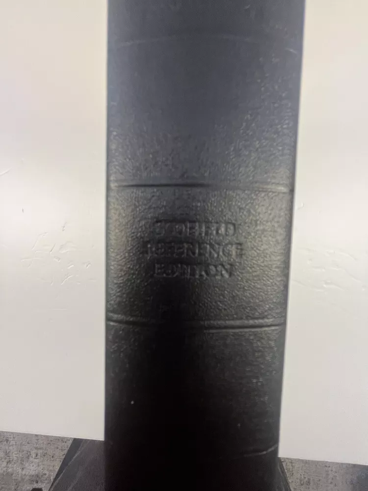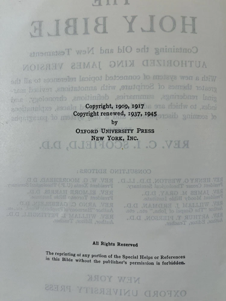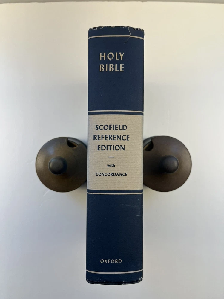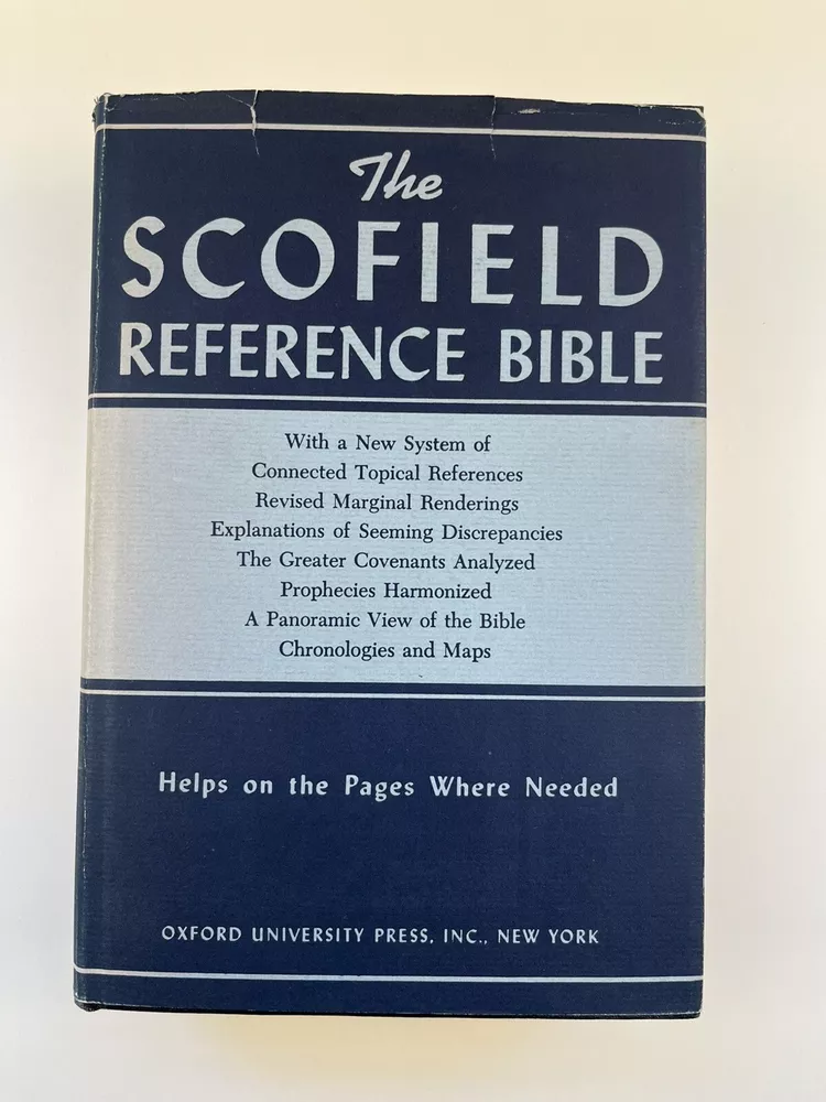 The Scofield Reference Bible 1945 C.I. Scofield in hardcover with a dust jacket. Please refer to the last photo for dimensions as this Bible is larger in dimensions than the smaller size with the same looking cover. This Bible contains scripture references, dictionary of scripture proper names, subject -index, and a concordance. There are also 12 colored maps. This is not a red letter edition. The binding is solid. The written content pages had no observed writing, underlining, or highlighting. There are two issues: 1) there is writing in ink on the first blank cover page- see photo 2) there are some tears on the dust jacket- see overall photos plus the last photo focuses on an inside view of the dust jacket.