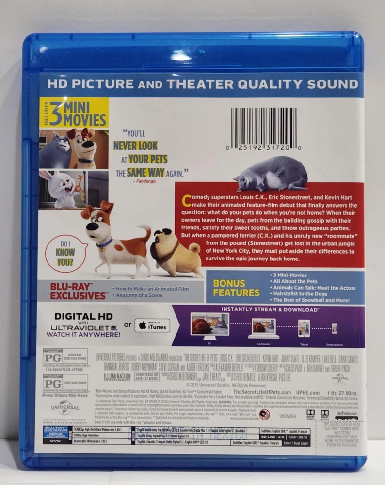 Get ready for an exciting adventure with "The Secret Life of Pets" on Blu-ray, DVD, and Digital HD. This family-animated movie, released in 2016 by Universal Studios, is rated PG and features a talented cast of voice actors. Follow the hilarious antics of a group of pets as they try to reunite with their owners after their beloved dog dies. This Blu-ray edition includes a 3D Blu-ray and a Digital HD version, making it the perfect addition to any movie collection. With English language and Region Code 1, this movie is a must-have for fans of animation and anime. Don't miss out on this exciting opportunity to own "The Secret Life of Pets" on multiple formats.