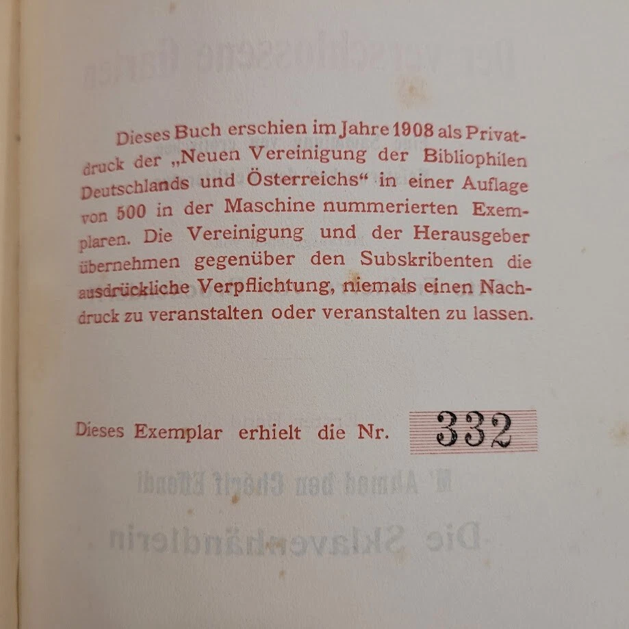 BOOK INFO: Very Rare German-language Limited First Edition (#332 of only 500 printed) of The Slave Trader / Die Sklavenhandlerin, by M’ Ahmed ben Cherif Effendi: Translated into German for the first time by Otto Freiherrn von Brockendorff. Published in hardcover in 1908 for Subscribers only, a classic of sadistic pornographic erotica. Hardcover without dustjacket, 197 pages, size 5 7/8" x 7 5/8". GERMAN LANGUAGE DESCRIPTION: Die Sklavenhandlerin, von M’ Ahmed ben Cherif Effendi: Zum erstenmal ins Deutsche ubertragen von Otto Freiherrn von Brockendorff / Der verschlossene Garten: Eine Sammlung von erotischen Meisterwerken der Weltliteratur / Erster Band / Dieses Buch erschien im Jahre 1908 als Privat-druck der Neuen Vereinigung der Bibliophilen Deutschlands und Osterreichs in einer Auflage von 500 in jer Maschine nummerierten Exemplaren. Die Vereinigung und der Herausgeber ubernehmen gegenuber den Subskribenten die ausdruckliche Verpflichtung, niemals einen Nachdruck zu veranstalten oder veranstalten zu lassen.Dieses Exemplar erhield die Nr. 332 ENGLISH LANGUAGE TRANSLATION: The Slave Trader, by M’ Ahmed ben Cherif Effendi: Translated into German for the first time by Otto Freiherrn von Brockendorff / The Locked Garden: A Collection of Erotic Masterpieces of World Literature / First Volume / This book was published in 1908 as a private print by the New Association of Bibliophiles of Germany and Austria in an edition of 500 copies Machine numbered copies. The association and the publisher undertake an express obligation to the subscribers never to organize or cause to be reprinted. This copy was given the number 332 CONDITION: An excellent antique copy of this rare book, Very Good overall condition only with light wear to cover edges. No prior owner handwriting; text is unmarked. No smoke or other odor. Not ex-library. SHIPPING NOTE: Calculated shipping cost is based on exact weight & dimensions of package that will be mailed, and the shipping destination. Shipping cost quoted is a fixed cost calculated by Canada Post on eBay, not by seller. Shipment is from Canada. Seller only accepts orders from Canada or United States. No international orders or shipments. Be sure to take a moment to check out my other listings, always interesting and scarce books. (L4-920-113)