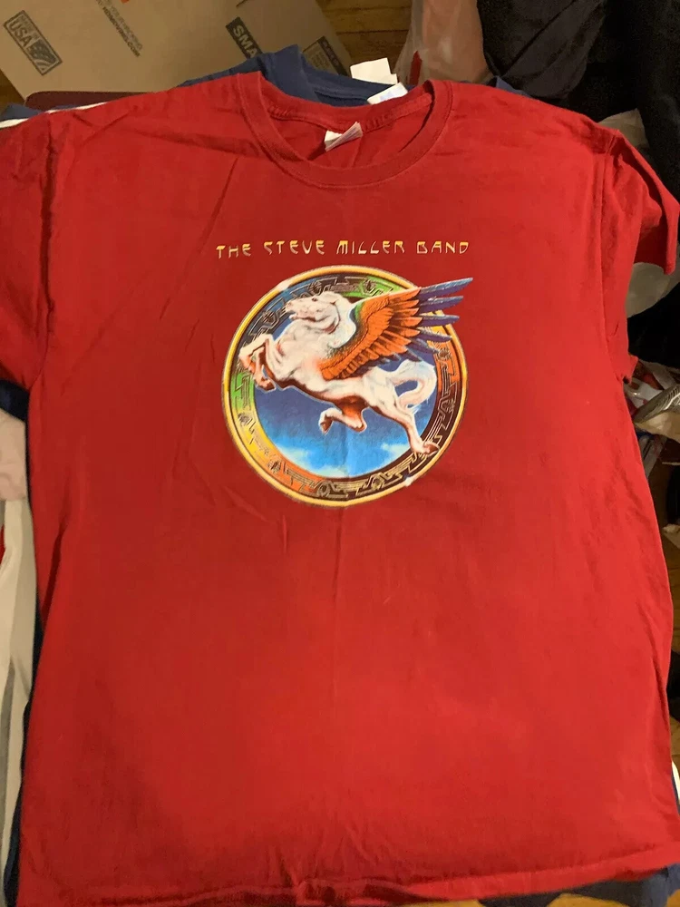 .5Show your love for the Steve Miller Band with this vibrant red T-shirt from their 2012 US tour collection. Made from comfortable cotton material, this short-sleeved shirt features the iconic band logo and character name, Steve. The shirt is available in size L for men and is perfect for any fan of the band. This Gildan brand T-shirt is a must-have for any collector of band merchandise. The shirt is ideal for casual wear and is sure to spark conversations about your love for the Steve Miller Band. Add this unique piece to your collection today!