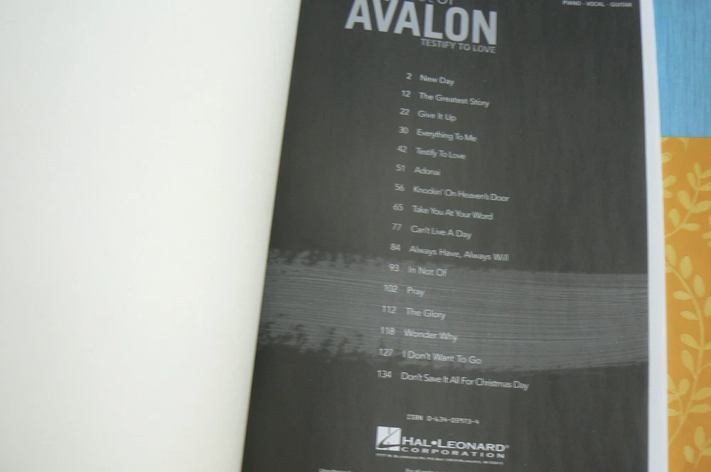 The Very Best of AVALON Testify to Love Vocals, Piano, Guitar Publisher: WORD Music, 2003 This folio features all 16 songs from the 2003 compilation by this acclaimed CCM vocal quartet: Adonai * Always Have, Always Will * Can't Live a Day * Don't Save It All for Christmas Day * Everything to Me * Give It Up * The Glory (Of the Blood) * The Greatest Story * I Don't Want to Go * In Not Of * Knockin' on Heaven's Door * New Day * Pray * Take You at Your Word * Testify to Love * Wonder Why. This 144-page softcover is in excellent condition with all pages crisp, clean, and sturdily bound; the cover shows light wear. Lots of great music here! Titles are shown in the third photo. You won't be disappointed! ~~~~~~~~~~~~ I'm listing MANY more books and other items. I'm happy to combine shipping. ~~~~~~~~~~~~~~~~~~~~~~~~~~~~ I normally mail ON the day I receive payment if it's received before 1 p.m. central time, and the next day if it's later than 1. Please take a look at my other listings; I'm listing many school books (and other items) and am happy to combine shipping! Items from smoke-free, pet-free home. Thanks so much for your time! Before leaving your feedback, if for any reason you feel I did not deserve or earn 5 stars in each category, please let me have the opportunity to make it right. I want every transaction to be 5-star worthy! Thanks so much! :)