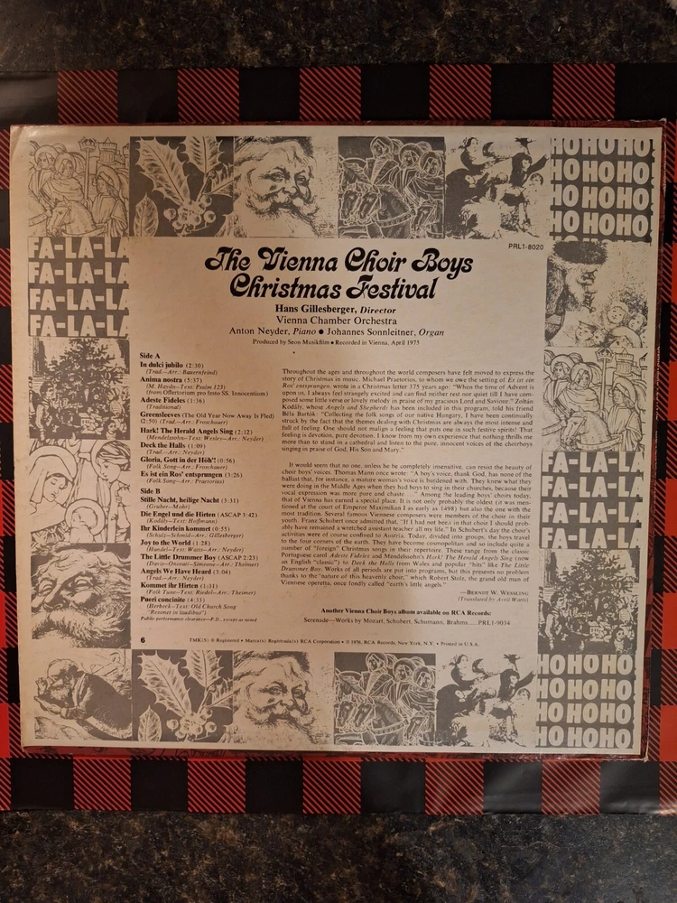 Format:RecordArtist:The Vienna Boys ChoirRecord Grading:Very Good Plus (VG+)Release Year:1976Occasion:ChristmasMaterial:VinylSpeed:33RPMColor:BlackSleeve Grading:Very Good Plus (VG+)Number of Audio Channels:StereoRecord Size:12"Features:Original Cover, Original Inner SleeveRecord Label:RCA Red Sealgtin13:Does not applyInlay Condition:Very Good Plus (VG+)Seller Notes:“Plays Well”UPC:Does not applyStyle:1960s, 1970sCountry/Region of Manufacture:United StatesType:LPRelease Title:Christmas FestivalCase Type:Cardboard SleeveEdition:First Edition, First PressingGenre:HolidayDuration:LP