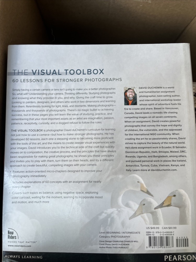 "The Visual Toolbox: 60 Lessons for Stronger Photographs by David Duchemin" is a trade paperback textbook published by Pearson Education in 2015. It belongs to the "Voices That Matter Ser." series and offers 60 lessons for improving photography skills. Written in English, this book covers techniques and digital aspects of photography, making it a valuable resource for both general photography enthusiasts and those looking to enhance their digital photography skills. With 288 pages, this visual toolbox provides practical guidance for creating stronger photographs through various lessons and tips from the author, David Duchemin.