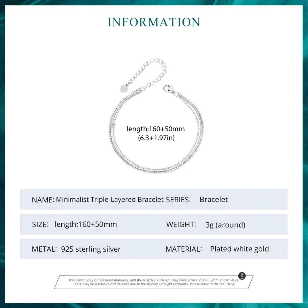 The minimalist triple-layer bracelet The Minimalist Triple-Layer BraceletAdd a touch of elegance to your everyday look with this stunning triple-layer bracelet. Made from 100% 925 sterling silver, this trendy piece is perfect for any occasion, whether it's a gift for your girlfriend, anniversary, engagement, party, or wedding.The bracelet features a sleek and minimalist design, with a geometric shape and no main stone, making it versatile and easy to pair with any outfit. The silver metal adds a touch of sophistication, while the chain and link style adds a modern twist.Measuring at 160+50mm, this bracelet is the perfect fit for any wrist. It is also made with a 925 sterling silver metal stamp and plated with white gold for a luxurious finish.As a bonus, this bracelet comes with a gift pouch, making it an ideal gift for your loved ones. Whether it's for your teen girl, girlfriend, best friend, sister, or daughter, this bracelet is sure to make them feel special and loved. The minimalist triple-layer bracelet The Minimalist Triple-Layer Bracelet Add a touch of elegance to your everyday look with this stunning triple-layer bracelet. Made from 100% 925 sterling silver, this trendy piece is perfect for any occasion, whether it's a gift for your girlfriend, anniversary, engagement, party, or wedding. The bracelet features a sleek and minimalist design, with a geometric shape and no main stone, making it versatile and easy to pair with any outfit. The silver metal adds a touch of sophistication, while the chain and link style adds a modern twist. Measuring at 160+50mm, this bracelet is the perfect fit for any wrist. It is also made with a 925 sterling silver metal stamp and plated with white gold for a luxurious finish. As a bonus, this bracelet comes with a gift pouch, making it an ideal gift for your loved ones. Whether it's for your teen girl, girlfriend, best friend, sister, or daughter, this bracelet is sure to make them feel special and loved. × × × × × × × × × × × × × Tell a friend Watch now Postage info Click the Postage tab above the listing description for more info FREE Postage Click the Postage tab above the listing description for more info! Additional delivery notes PICK UP OPTION Sorry, our items are NOT available for pick-up. PAYING VIA PAYPAL We accept PayPal on our all our items so you can shop with confidence. Simple choose the PayPal option when proceeding through the checkout. Additional Information No additional information at this time Ask seller a question You might also like Eye of Horus Open Ring Water Droplet Ring Pearl Earring Vivid Tassel Long Earrings Contact To contact our Customer Service Team, simply click the button here and our Customer Service team will be happy to assist. Ask seller a question © Piecesia Postage Shipping is FREE for this item Payment Accepted Payment Methods PayPal Returns Returns are accepted Items must be returned within 30 days of the auction ending Buyer will pay for return shipping. eBay integration by