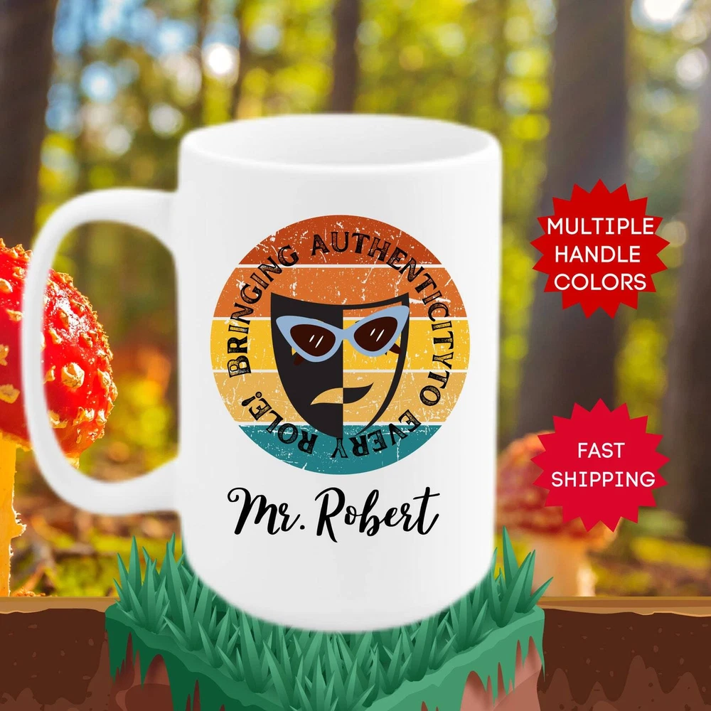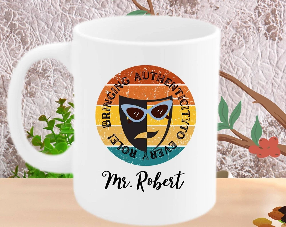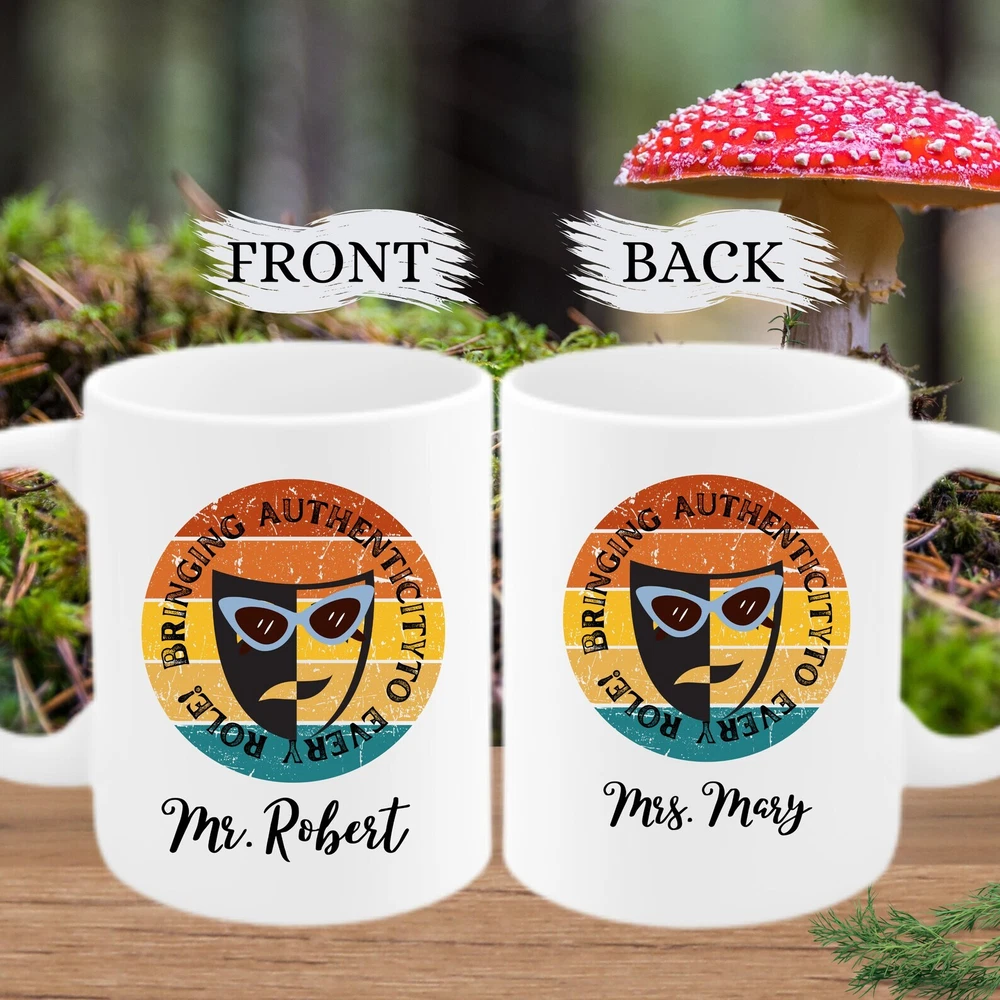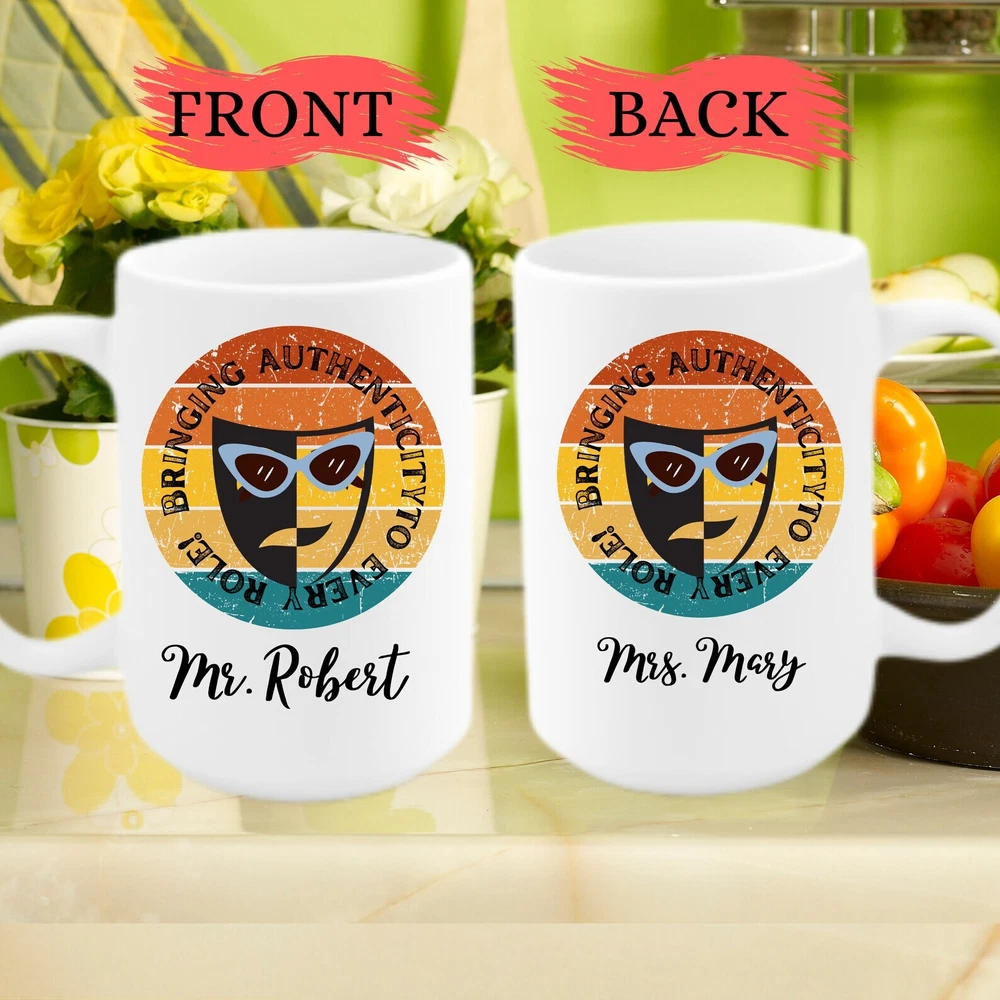Theater Teacher Gift Drama Teacher Mug Theatre Gift Personalized Theatre Mug Gift Mr Mrs Theater Acting Lover Actor Mug Actress Gift Product Details.. This high quality 11oz. ceramic white mug has a premium hard coat that provides crisp and vibrant color reproduction sure to last for years. Perfect for all hot & cold beverages. The highest quality printing possible is used. It will never fade no matter how many times you wash it. Material: 100% Ceramic. Print both sides. Dishwasher and Microwave Safe. High Gloss + Premium White Finish. Printed in the U.S.A. Personalized & Custom. We support personalized and custom mug to add custom, when placing an order, you can add notes to the "order note" in shipping address section. Also you can contact us directly via message. Shipping Info. Ready to ship in 1 to 2 business days, All products are made-to-order and proudly printed in the United States. Shipped by USPS and DHL, You will receive your order in 5-7 days. Replace & Refund. All products are defective during shipping broken, chipped will be replaced free of charge. You are not satisfied with the product, we will refund 100% money to you. If any other issues arise, please do not hesitate to message, we would be more than happy to assist you.