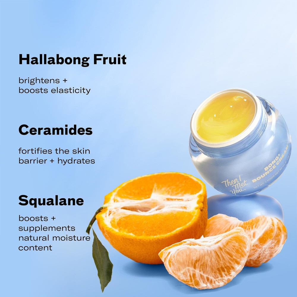 Then I Met You Bong² Bounce Cream, Lightweight Gel Cream Barrier Moisturizer with Hallabong Extract, Omega-3 Fatty Acids, Squalane, and Ceramides, Cruelty-Free, Hydration for Oily Skin, 1.69 fl oz - Buy Now with Fast Shipping! Then I Met You Bong² Bounce Cream, Lightweight Gel Cream Barrier Moisturizer with Hallabong Extract, Omega-3 Fatty Acids, Squalane, and Ceramides, Cruelty-Free, Hydration for Oily Skin, 1.69 fl oz Product Details Brand: Then I Met You Item Volume: 1.69 Fluid Ounces Item dimensions L x W x H: 2.67 x 2.64 x 2.56 inches Age Range (Description): Adult Special Feature: Lightweight Product Dimensions : 2.67 x 2.64 x 2.56 inches; 7.37 ounces UPC : Manufacturer : Then I Met You Country of Origin : Korea, Republic of Key Features ✅ HALLABONG RESILIENCE BARRIER COMPLEX: Powered by Hallabong, a fruit known for its rich Vitamin C content grown exclusively on Jeju Island, and skin-nourishing fatty acids like squalane and ceramides, this formula harmoniously fortifies the skin barrier for a bouncy glow. ✅ NOURISHING NECTAR: Hallabong are known as the Honey coated orange. We formulated Bong2 Bounce Cream with honey extract because it draws moisture from the air and binds it to the skin. The humectant properties impart lightweight but long lasting hydration to achieve honey skin results dewy skin that's deeply plumped with nourishment ✅ TANTALIZING TONE & TEXTURE: Like sunshine in a jar, Bong2 Bounce Cream will brighten your day and skin with our signature marigold hue (a la the Living Cleansing Balm) derived from seaberries and persimmon to delight the skin and senses with its unique bouncy gel cushion texture and deliver succulent, juicy hydration ✅ BREATHABLE BARRIER PROTECTION: Traditional barrier creams often boast thick and heavy formulations that can lead to pore congestion. This airy barrier cream provides a breathable layer that protects the skin from environmental stressors while feeling fresh and weightless. The innovative formula is ideal for daily wear especially under makeup. ✅ HOW TO USE: Apply a layer onto your face and neck using your fingertips or spatula. Use twice daily, morning and night. ✅ LEAPING BUNNY CERTIFIED: Absolutely no animal testingever; from formulation to final product, every ingredient and partner meets the highest cruelty-free standards, backed by verified sourcing and third-party oversight. Traceable. Transparent. 100% guilt-free. Product Description