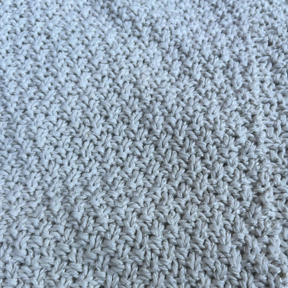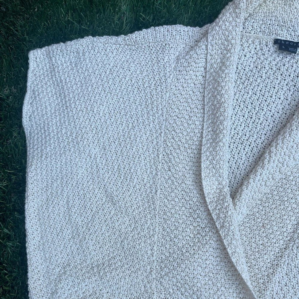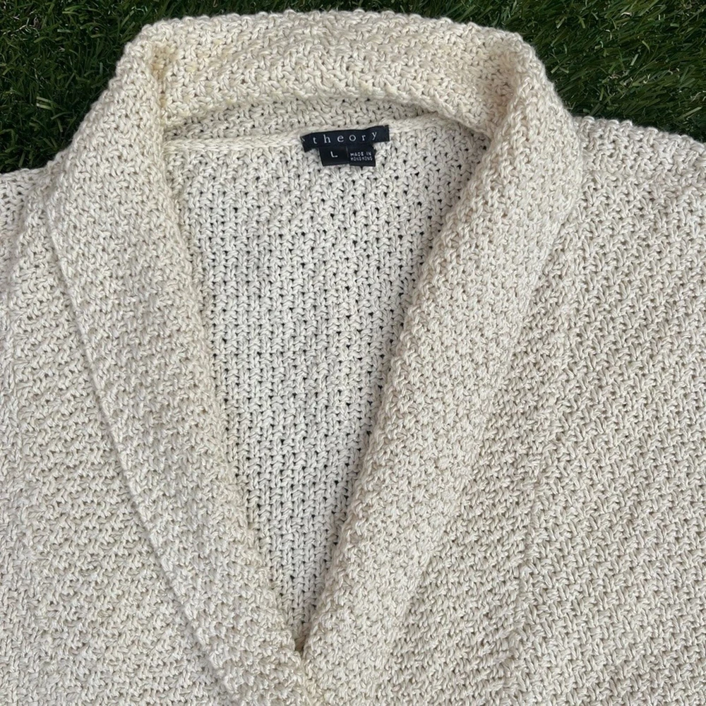 Pre-owned Shawl Sweater Top by Theory. Creme off white in color, with a silver detail weaved within the knit. Size L in women. Measurements: Pit 2 Pit: 30 inches Width at waist ( sweater bottom) 22 inches Length from shoulder to bottom hem: 22 inches Good pre-worn condition. Overall Clean, with no major stains or marks on the sweater. Cable knit weave is in good condition, no holes or snags. all of the seams are in good condition, no fraying thread. buttons are attached and functional. Review all photos for more details on tops condition. Beautiful detail in the collar, blazer like neckline, and three chunky y2k 90's buttons for a bottom closure, batwing sweater style. Shoulder drop sleeves for an oversized boxy crop look that is great for business casual, holiday and new years outfits, or a lovely layer over a dress. Made of a Linen Cotton Blend, however there is a very heavy weight to the garment. Much like a wool sweater. See tag for fabric content details. Retailed $268