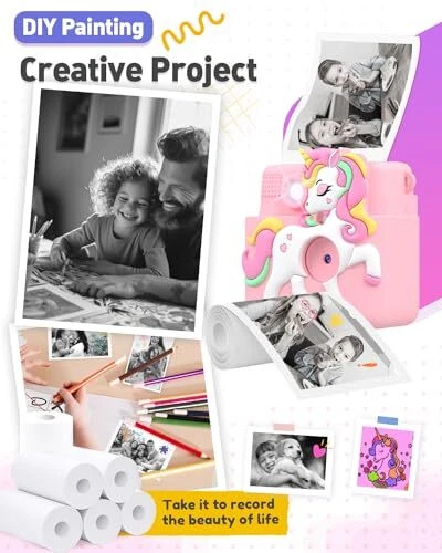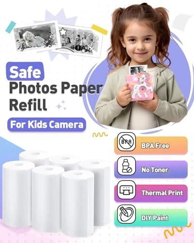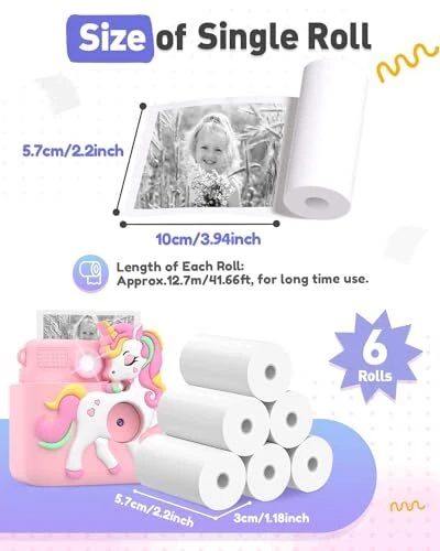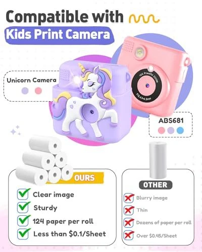Specifications: 6 rolls of thermal paper. Each roll can print approximately 124 photos with length of 41.66ft. Single paper size: about 4'' x 2.2''(L x W). Diameter of rolls is 1.18", which is suitable for most camera and printer. BPA Free Thermal Paper: Without toner, children can DIY themselves easily, such as write, color and paint every picture after printing. Glossy, safe in material and enough thickness make it very enduring for stocking photos. Compatibility: This thermal paper refill is suitable for kids camera and other thermal B&W printing instant camera,such as ABS 681. There are clear manual and video tutorial to help you instruct feeding paper. Change the paper direction if print blank. A Cost-Effective Photo Paper You Should Choose: Compared with other printer paper roll, our paper is more affordable. Little photographer can capture and take many pictures for every wonderful moment of joy.