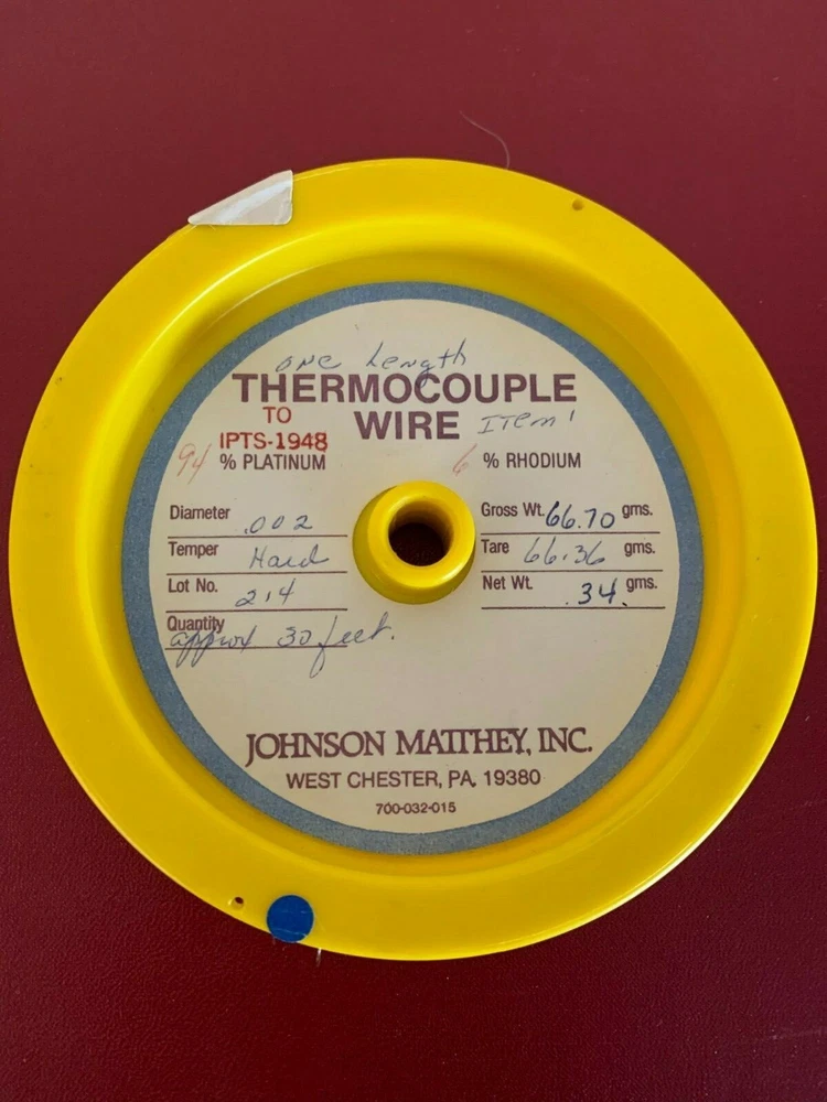 Thermocouple Wire 94% Platinum 6% Rhodium 0.002" diameter, $6.00/inch, Shipped with USPS First Class . Size will be cut and be perfect as new condition. $6.00/in. Only 50 inches for the quality are listed due to limitation of eBay. Please let us know if you want to buy more. No return is accepted if buying cuttings. Return is accepted if buying whole roll. Domestic Shipping Cost: $5.75 per order, no matter how many inches you purchase.