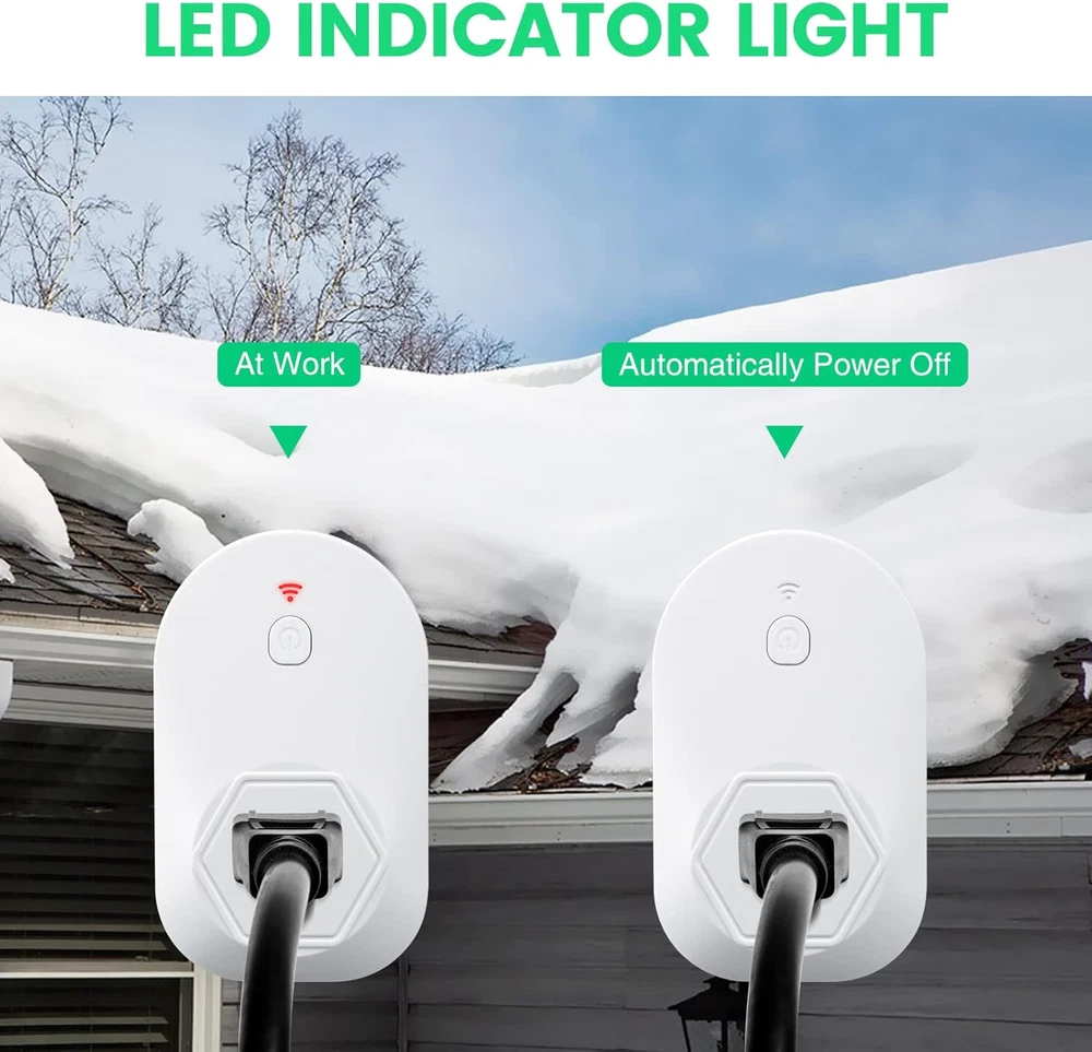 THERMOSTATIC CONTROL: This thermostat will automatically turn on the connected heaters when the outside temperature drops below 35°F, and turn it off when temperature reaches about 48°F. Perfect solution to the trouble of water freezing. Let you have a comfortable winter! SAVE TIME & MONEY: Automatic activation saves your time, no need to plug cable back and forth when temperature fluctuates. It uses power only when necessary, thus helps save a lot on your electric bill. EASY TO USE: No assembly required, plug-n-play. Just plug the thermostat into a power socket, and plug your 120V heating device into the thermostat outlet, you are ready to go. Suitable for both 3 prong and 2 prong plug. DURABLE & RELIABLE: Adopting UL listed and TUV-certified sensor, and covered with PC+ABS V0 grade flame retardant material, safe to use. The LED light shows whether the heaters is running, very convenient. WIDELY USE: With a maximum load of 16A, this temperature controlled outlet is widely used for pipe heat tape, roof heating cables, pond de-icers, bird bath heaters, automotive battery heater, chicken farm, dog house, pump house etc. Product Description Auto Thermostatic Control The temperature controlled outlet can effectively sense the ambient air temperature to turn on at 35 degrees Fahrenheit and off at 48 degrees Fahrenheit, saving energy and effort by using power only when necessary. Suitable for 3 & 2 Prong Plug Suitable for both 3-prong and 2-prong plug. Convenient for you to use in many different heating equipment. Safe & Convenient Adopting UL listed and TUV-certified sensor, and covered with PC+ABS V0 grade flame retardant material, safe to use. The LED light shows whether the heaters is running, very convenient.