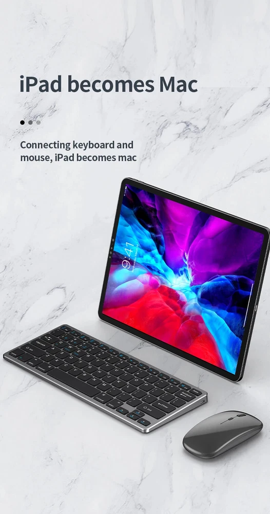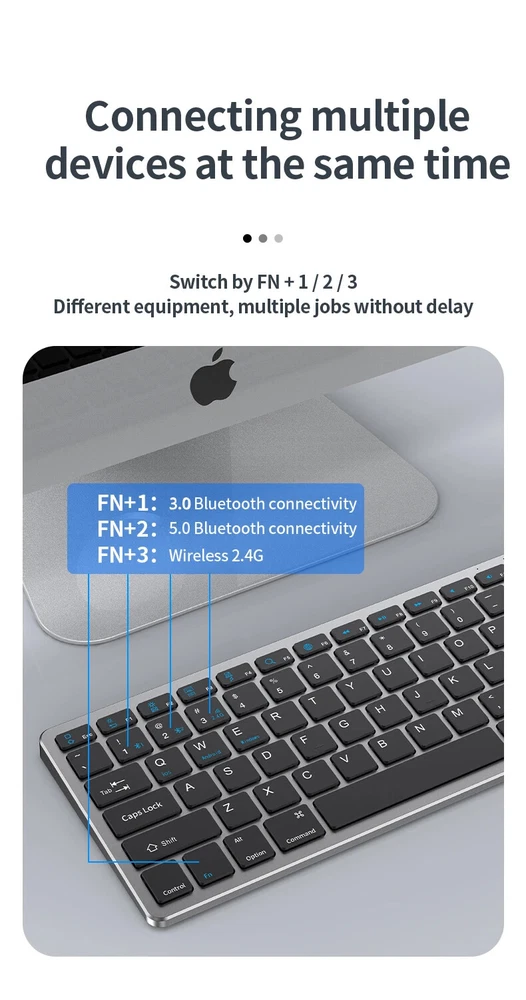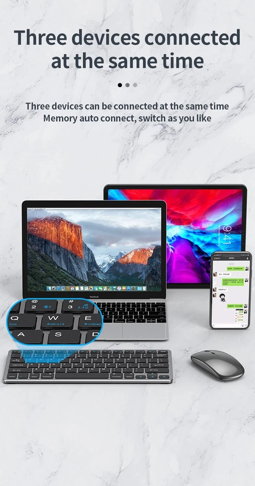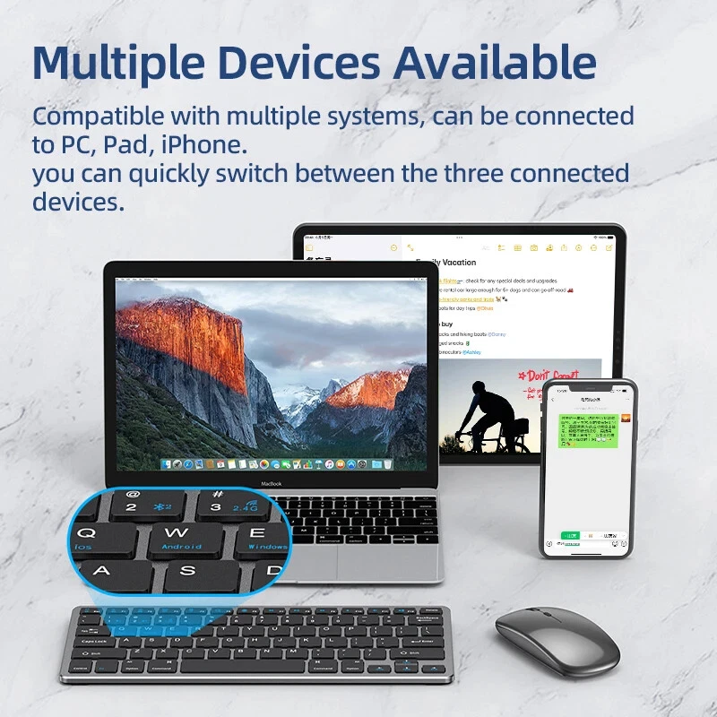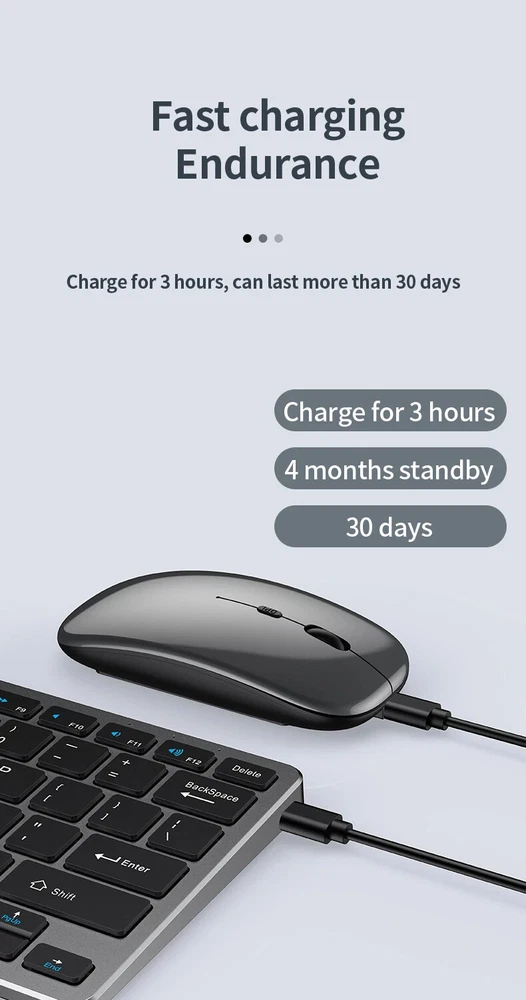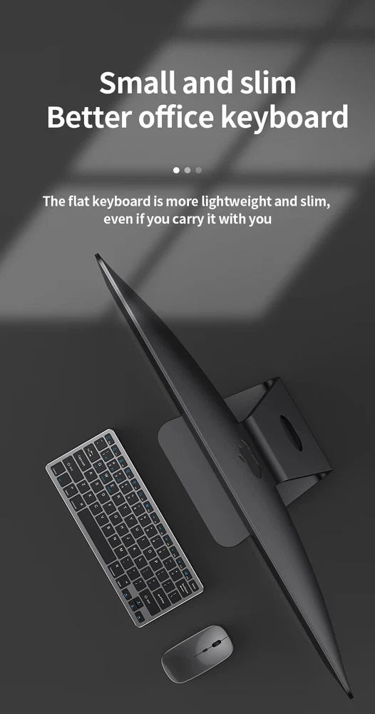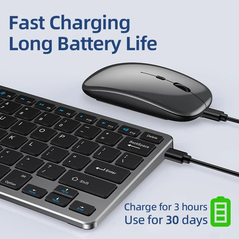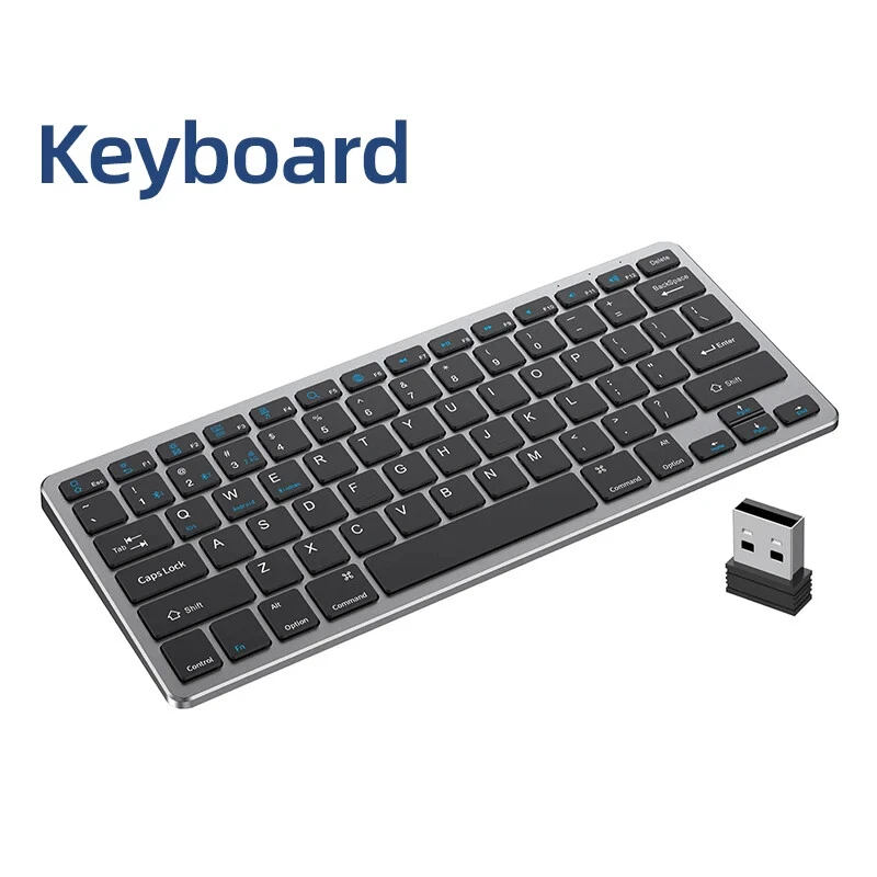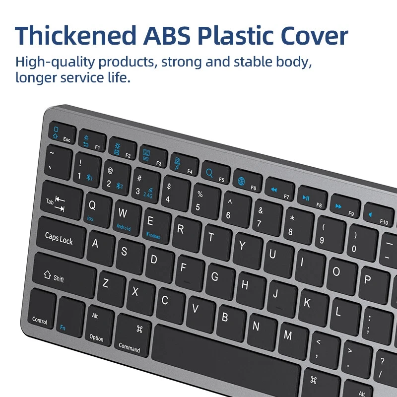 Thin Small Wireless Bluetooth 5.0&2.4G Keyboard,78 Keys,USB Charging. 6 Major Reasons To Choose This Keyboard 78-key simple design, multi-function keys to meet usage needs, small and slim appearance, easy to carry; Thickened ABS plastic body, thick feel, sturdy and durable; Supports BT 5.0+BT 3.0+2.4G, can connect to three devices such as PC, Pad, iPhone at the same time, through shortcut key selection, efficient and convenient to use; Compatible with Windows, Android, IOS multiple systems, adapt to a variety of device terminals, to meet the needs of various scenarios; Built-in battery, rechargeable design, charging for 3 hours, battery life up to 30 days; Silent button design, whether used at home or in the office, will not easily disturb others; Secifications Keyboard 1. Color: Tin Grey 2. Material: Thickened ABS 3. Button life: 3 million times 4. Wireless distance: 5-10m 5. Battery capacity: 800mAh 6. Charging cable length: 50cm 7. N umber of keys:78 8. Compatible Systems:Windows,Android,IOS 9. Rated voltage/current: 3.7V/18mA 10. Power supply typerechargeable (charging time 3 hours, working 200 hours) Mouse 1. Color: Tin Grey 2. Material: ABS 3. Button life: 3 million times 4. Wireless distance: 5-10m 5. Type: Ergonomic Optical Mouse 6. Resolution: 800 1200 1600 (default 1200dpi) 7. Operation mode: photoelectric type 8. Rated voltage/current: 3.7V/18mA 9. Power supply type: rechargeable (charging time 3 hours, working 200 hours) 10. Type: BT+2.4G wireless mouse 11. Buttons: 2 buttons, 1 scroll wheel (middle button) and DPI key Usage tutorials and steps Step 1: Take out the keyboard from the box and check whether the appearance is intact. Step 2: Remove the mini receiver at the bottom of the keyboard, insert it into the computer USB interface, plug and play. Step 3: Turn the power switch to ON to turn on the keyboard.The system defaults to 2.4G connection mode. Plug the receiver into the computer and you can use it. Step 4: In Bluetooth mode, press and hold the Fn function key + 1/2 number key for 5 seconds. When the blue light flashes, it enters the search state. Add it in the Bluetooth setting interface of the terminal device and you can use it. Kind tips: 1.This product has built-in lithium battery, keep away from fire sources. 2.The charging cable is included in the package, please check it carefully when unboxing. 3.When there is a delay in cursor movement, please plug the charging cable into the USB to charge. 4.It can be used when powered by USB, please stop in time when fully charged. 5.When the keyboard is not used for 30 minutes, it will automatically enter sleep mode and can be woken up by clicking the button.