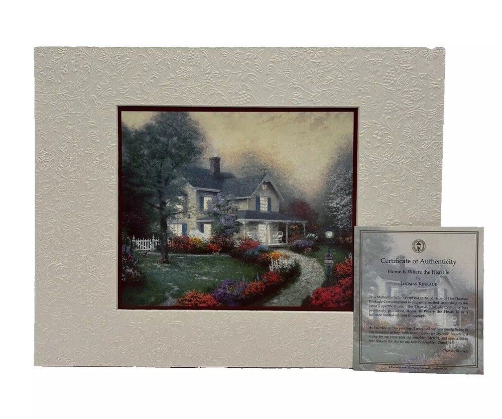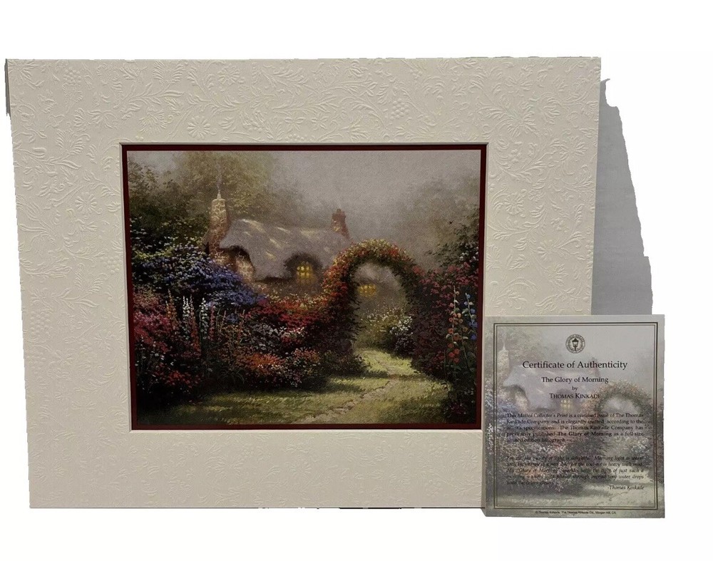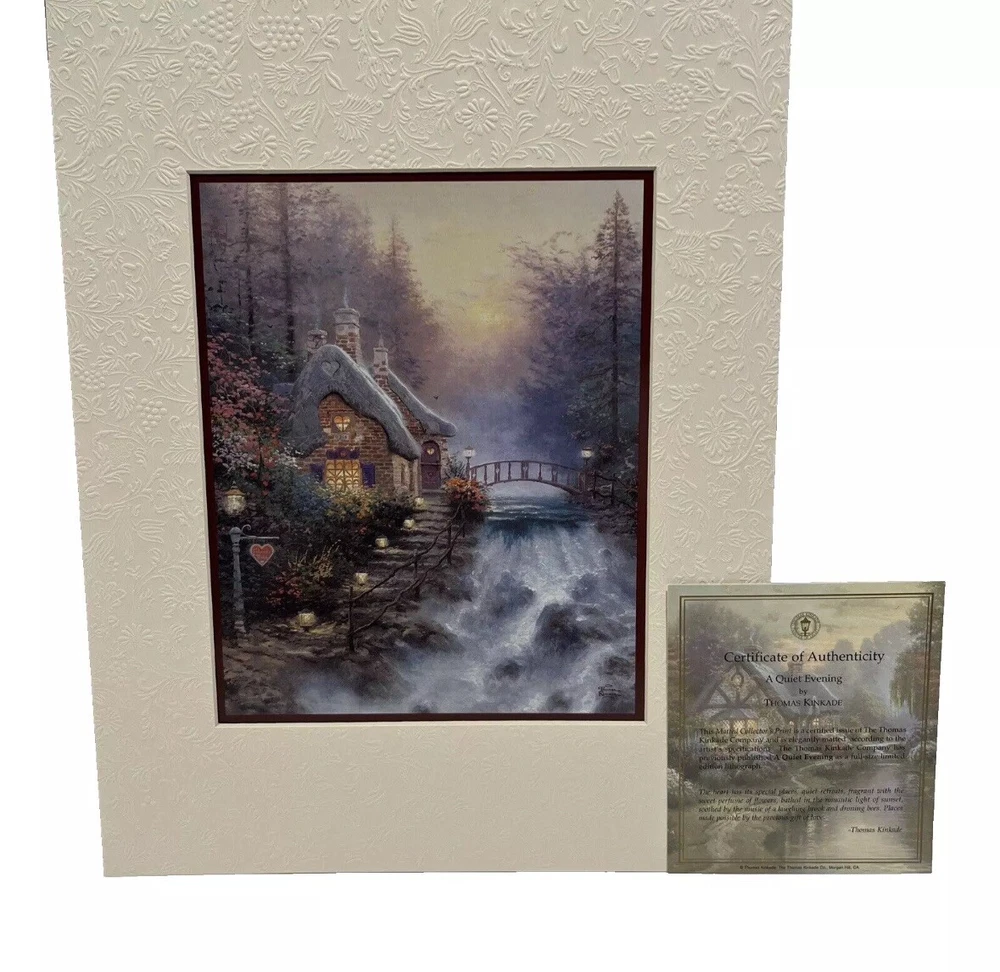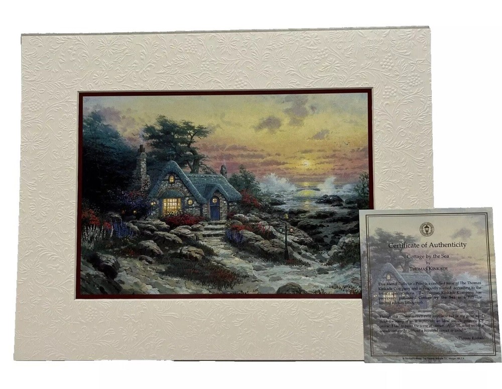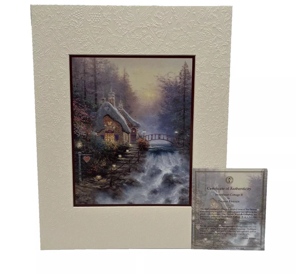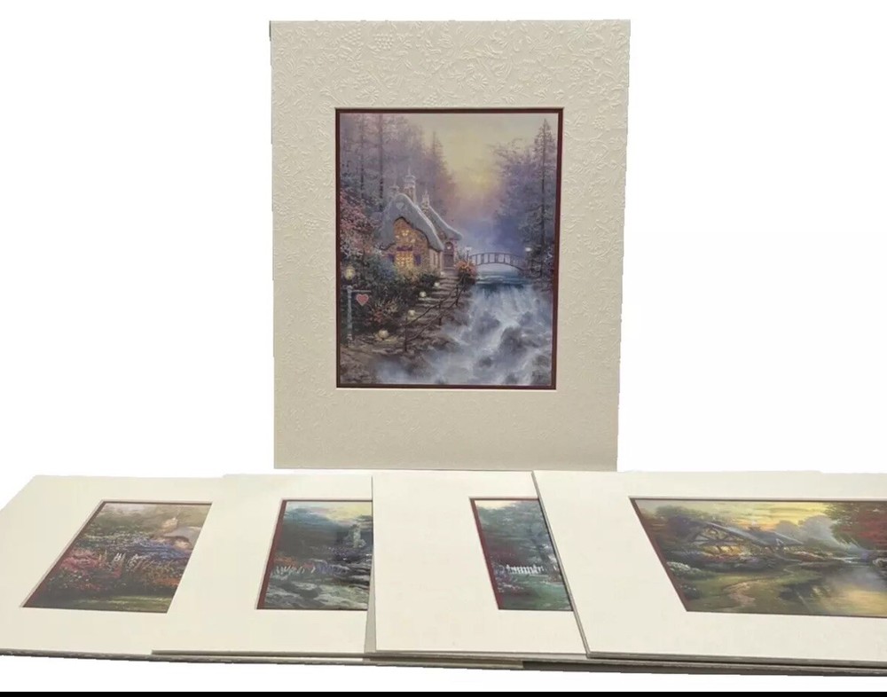 BRAND NEW IN SEALED BOX Thomas Kincade 2004 Five Matted Prints Romance Collection The Matted Collector's Print is a certified issue of The Thomas Kincade Company and is elegantly matted according to the artist's specs. The Thomas Kincade Company has previously published each piece as a full size limited edition lithograph. You will be receiving: A Quiet Evening (Quiet retreat with sunset, a brook and droning bees); Sweetheart Cottage II (romantic hideaway nestled next to a little waterfall); The Glory of Morning (morning light with the energy of a new day); Cottage by the Sea (cottage that exists only in your mind); Home Is Where the Heart Is (imaginary home with wicker chairs, a swing and teddy bear). Items are from a pet and smoke free home. Special care will be taken when shipping.