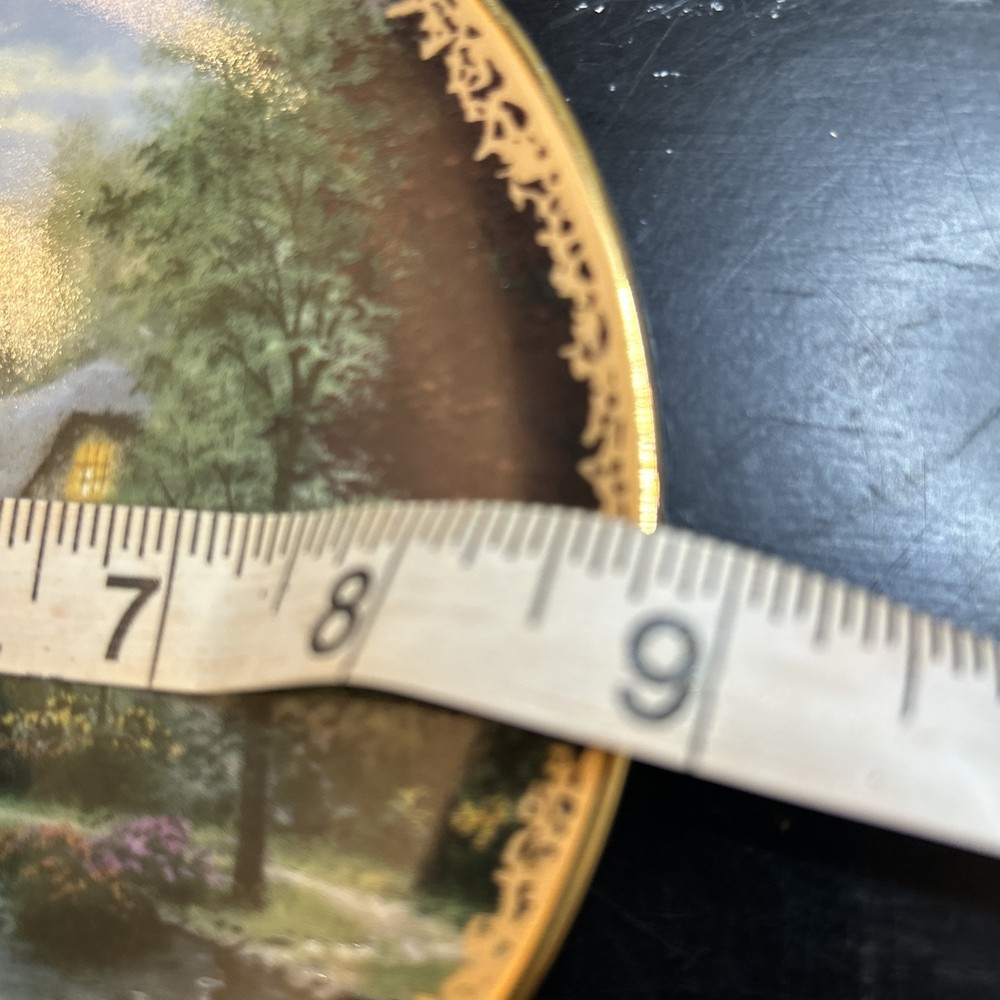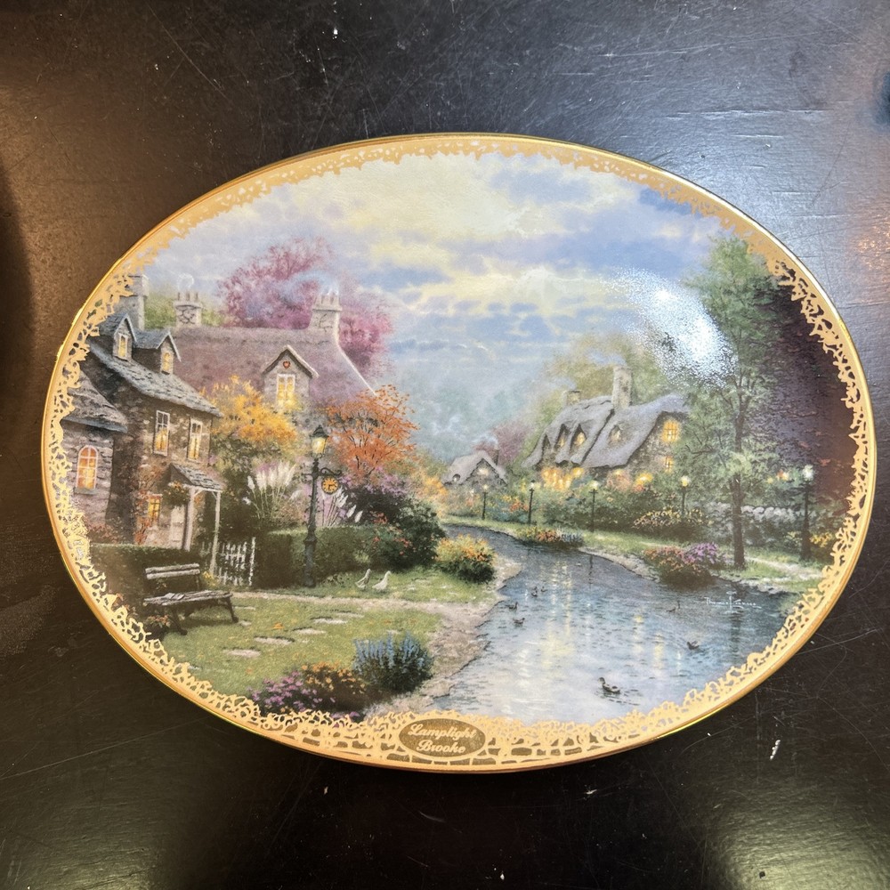 This beautiful oval collector plate by Thomas Kinkade features the charming scene of Lamplight Brook. The plate is a perfect addition to any collection of decorative collectibles. With its intricate design and exquisite craftsmanship, it is sure to impress any admirer. The plate is a great gift for any Thomas Kinkade fan or collector, and would make a perfect display piece in any home or office.