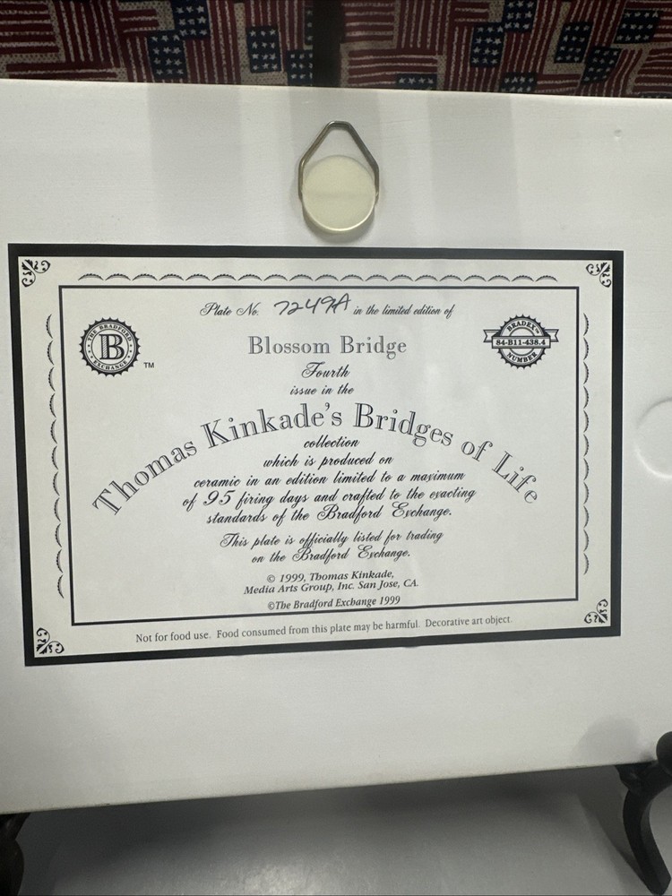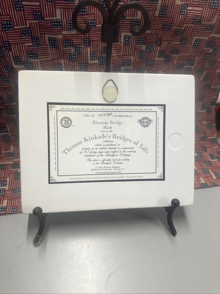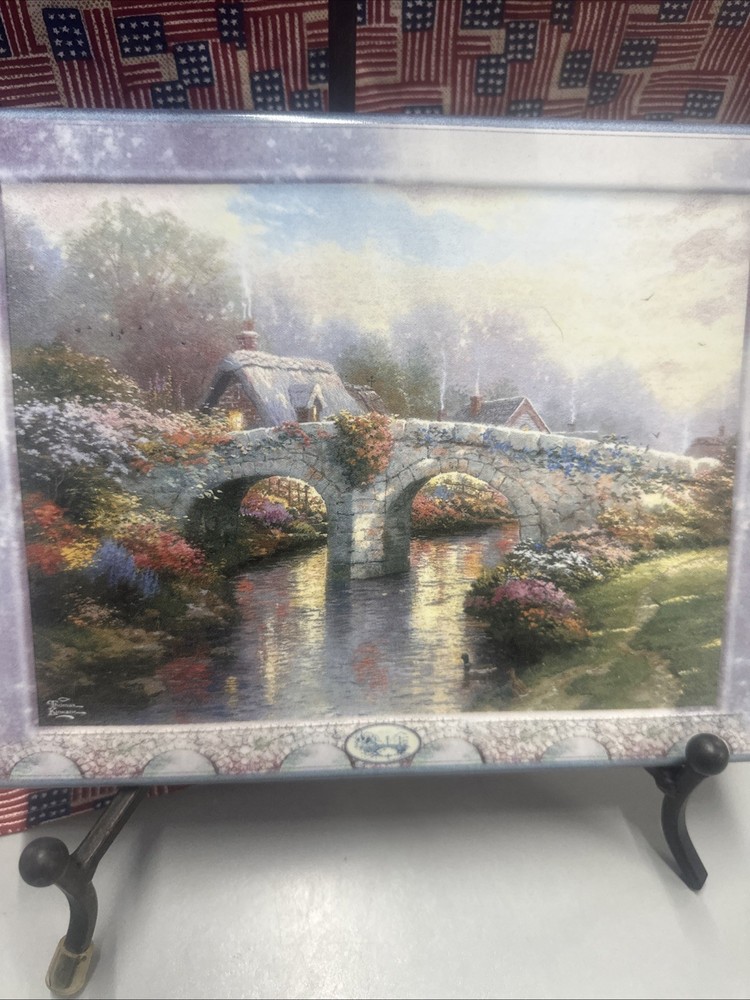 The Thomas Kinkade's Bridges of Life Blossom Bridge Fourth Bradford Exchange collector plate is a vintage decorative piece featuring a floral pattern with a multicolor design. This rectangle-shaped ceramic plate depicts a scene from Thomas Kinkade's Bridges of Life series, showcasing his unique style and artistic touch. Produced in California in the late 20th century, this art pottery piece is a beautiful addition to any collector's display, capturing the essence of American culture and timeless beauty.