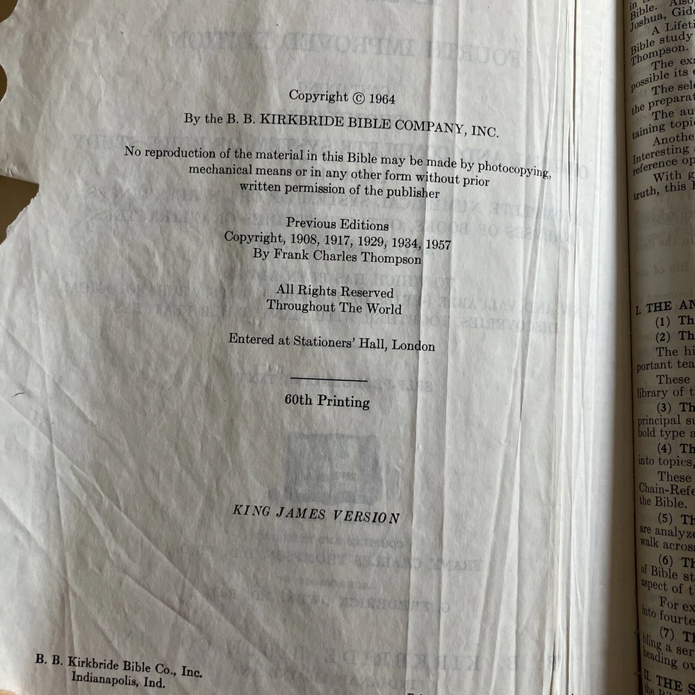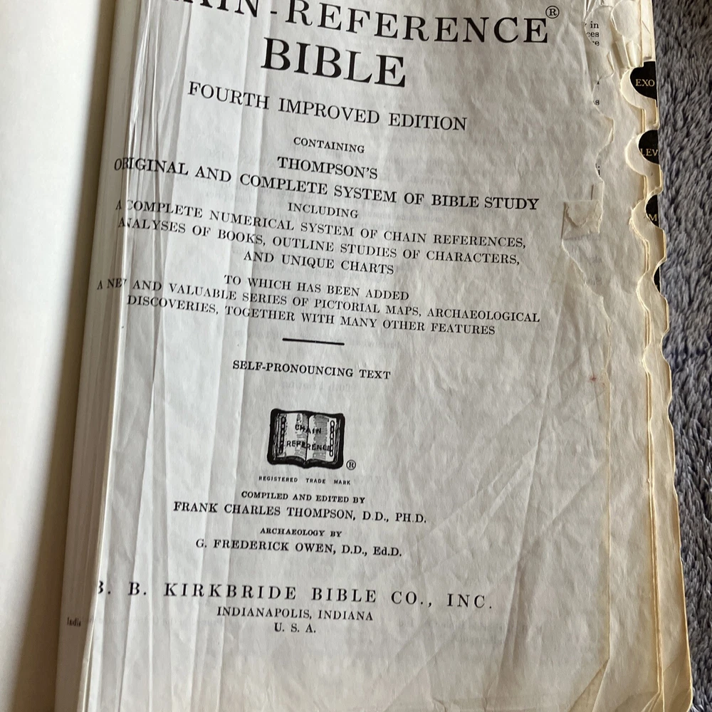 Index is missing tabs———-Taped Notes- Many Markings,still solid———-The product is "The New Chain-Reference Bible 4th Improved Edition KJV Thompson Bible Study 1964" published by BB Kirkbride Bible Co. in Indianapolis, USA. It is an original English language Bible with self-pronouncing text, maps, concordance, illustrations, and a Bible study system. The unit includes special attributes like an index and is authored by God, focusing on Christianity and Bibles. This unique unit is a valuable reference tool for individuals interested in studying and understanding the teachings and principles of the Christian faith. Please see all photos.I Only Ship Overseas Through Ebay Global Shipping, If you are unhappy with item,please contact me to resolve the problem before opening a case,I value your business and work hard to keep a top seller rating, Thank You!