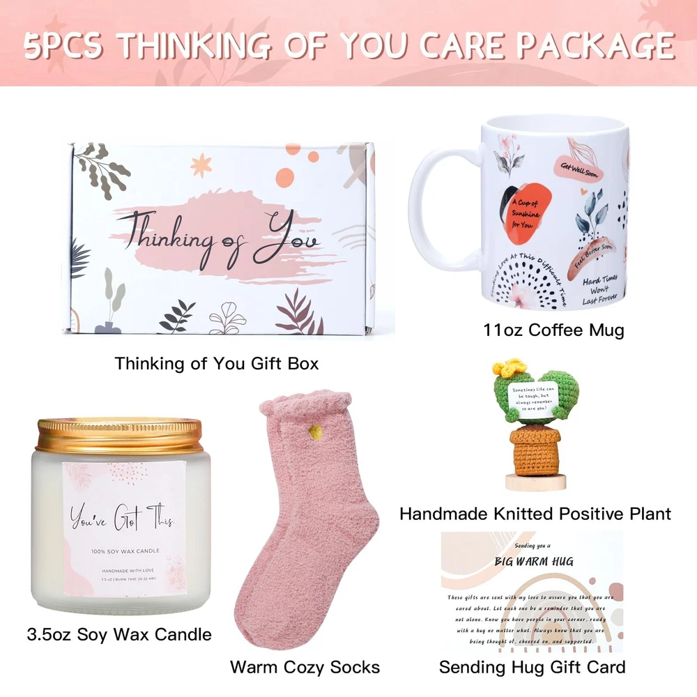 Get-Well Soon Gift Baskets for Women - Thoughtful Comfort Gifts for After Surgery Recovery - Thinking of You Feel Better Care Packge for Sick Friends Product Details Item Form: Liquid Scent: Lavender Brand: MUGEEY Product Benefits: Comfortable Skin Type: All Product Dimensions: 3.22 x 3.22 x 3.74 inches Item Weight: 1.63 pounds Manufacturer: MUGEEY Country of Origin: China Item model number: 1402-5pcs Date First Available: December 20, 2023 5PCS Get Well Soon Gift Baskets for Women After Surgery--Looking for heartfelt gifts to convery your comfort and encourangement to your best friend? Choose our thinking of you gift set.Packed with a 11oz coffee mug, a handmade crochet knitted cactus plant with stand,a 3.5oz Lavender scented soy wax candle,warm soft fuzzy socks,a "Sending you a BIG WARM HUG"gift card. These will be a reminder that they are being thought of and supported. Get Well Gifts for Women--Our Get Well Gift Baskets for women are the ultimate pick-me-up gift box.From after surgery care packages to Feel Better Soon gifts, these thoughtful preasents are designed to cheer up, for easy recovery, and brighten your loved ones' day. It's a perfect wellness gift for your Best Friends, Wife, Mom, Sister, Aunt, Mother-in-Law,Gradma or Colleagues! Sending Love&Hugs in a Box--For those who are in a tough time, this care package will be a good fit to express your love.The mug is printed with lots of sweet self affirmation sayings, such as "get well soon, feel better soon, a cup of sunshine for you, healing for the soul, you are amazing, a hug in a mug, just breathe",the handmade knitted cactus plant holds a card with a uplifting messages "life is tough but so are you", the candle has "you've got this" , the big warm gift card is also a good way to let her know you are sending hug and love. Self Care Package for Relaxation--It's a great spa gift for women. Whether she's in a recovery, experiencing a hard time, in times of grief or during challenging moments,show your care and support by gifting a moment of relaxation and rejuvenation to your loved ones becomes easy with our spa-like kit. Elevate the spirits and enjoy the luxurious retreat to aid in healing and relaxation with our get well care package. A Versatile Gift Set-- Our inspirational gifts for women are designed for a variety of gifting situations: get well gifts, sympathy gifts, after surgery recovery gifts, cancer, feel better gifts, relaxing spa kit,comfort,hug, pampering,calming, encouragement,greif, condolences, bereavement,healing, uplifting, stress anxiety relief, thinking of you, warm and cozy gift, hygge, birthday gifts. And it's also great for any holidays: Valentine's day, Mother's day, anniversary, Christmas